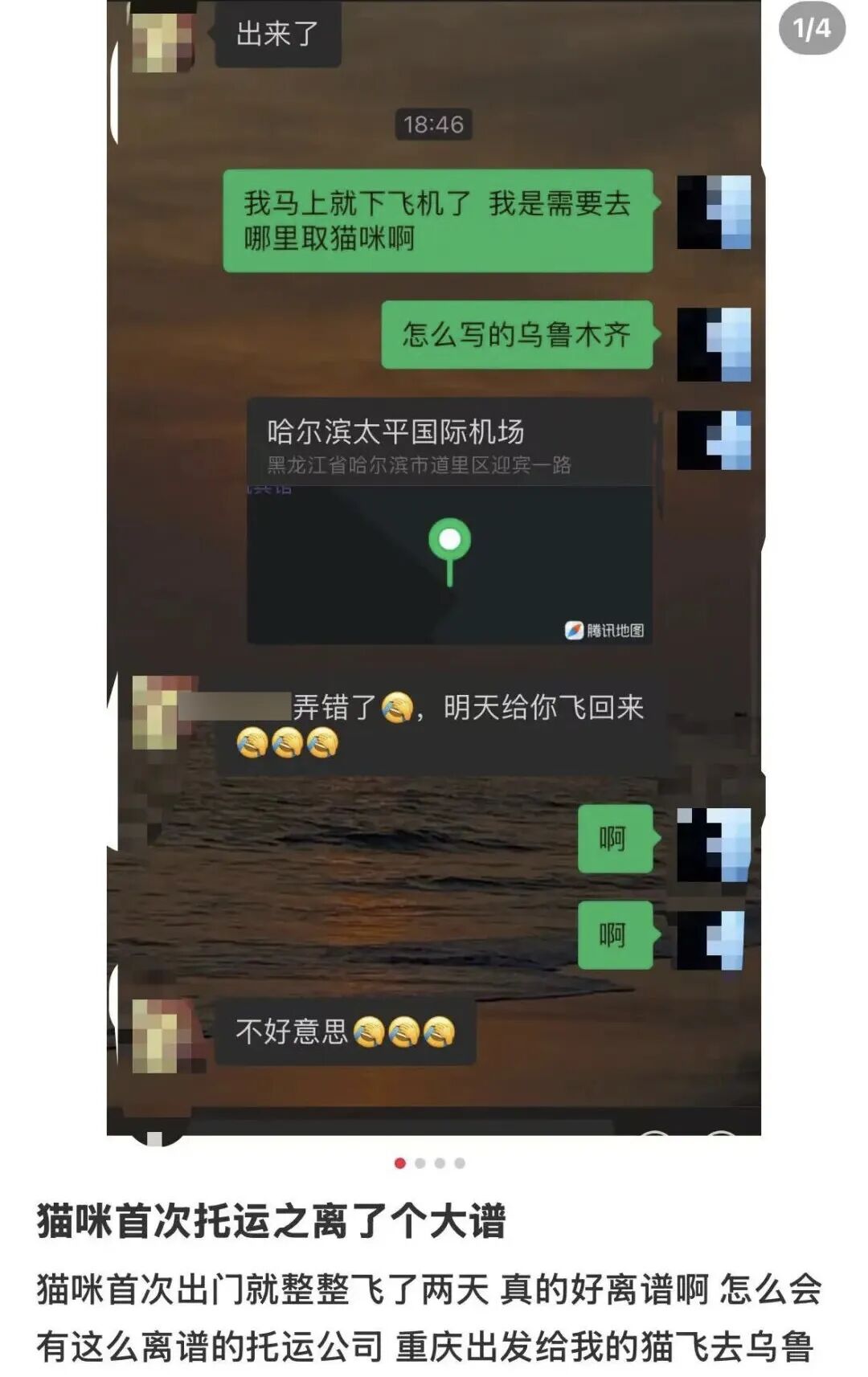 但对方误将猫错送至乌鲁木齐,