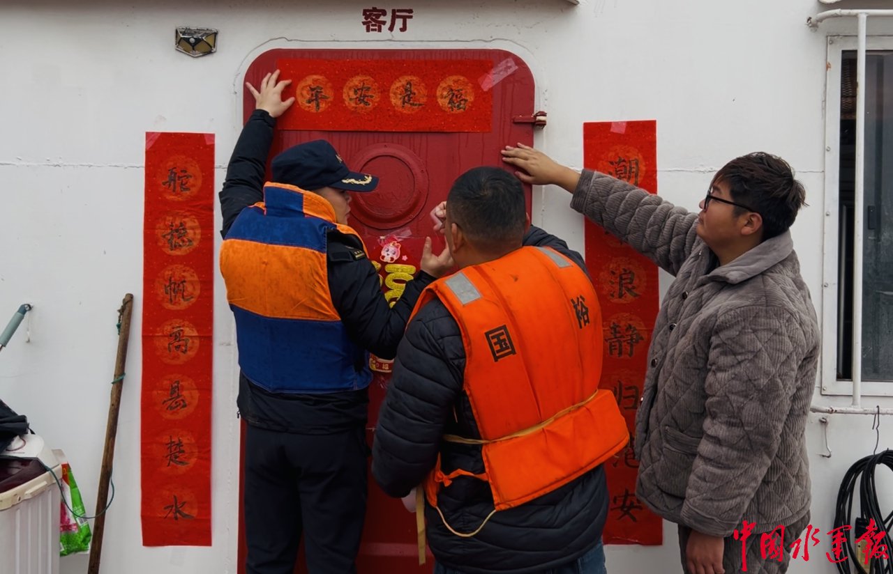 最后的“平安春联送船头”环节,海事执法人员走进作业船舶、锚泊船舶,将平安春联送到船员手中,并与大家互动贴春联、福字,让坚守在航运一线的船员们在船上也能感受到浓浓的年味儿。