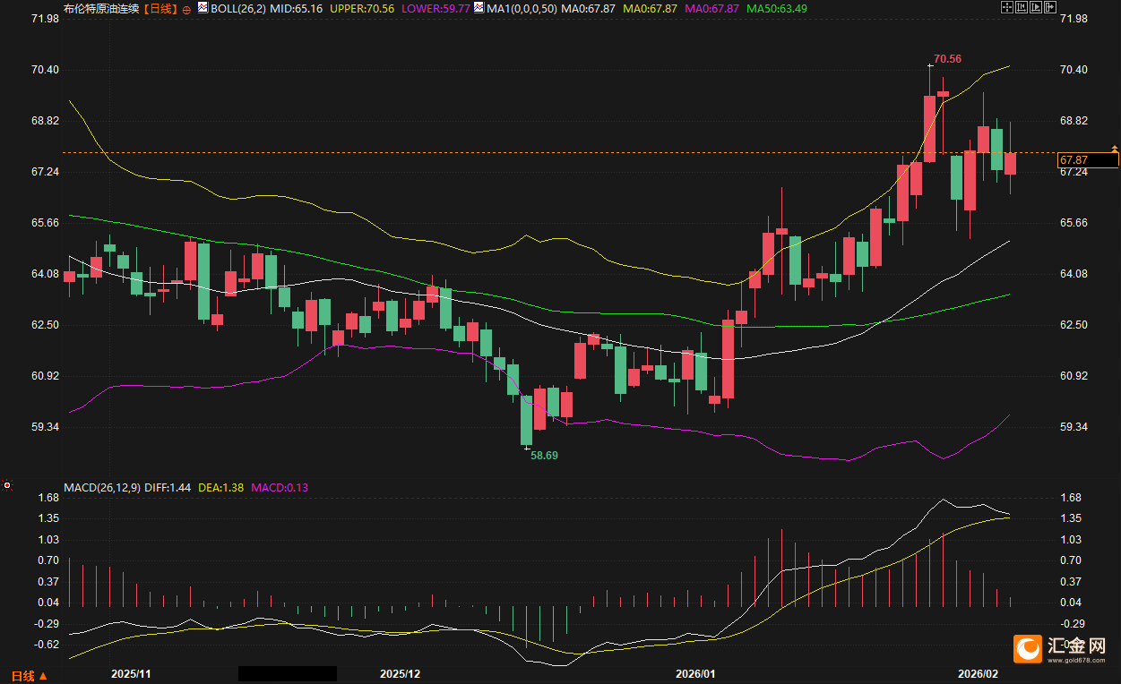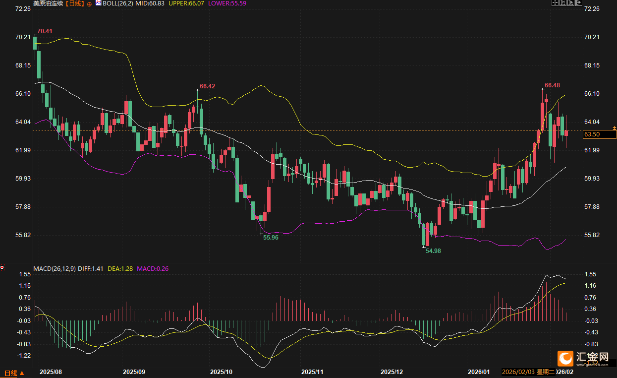 2月2日-2月6日当周,国际原油市场经历了剧烈震荡,多空力量在高位展开了极为激烈的博弈。地缘政治紧张局势的反复与美国经济数据的疲软交织在一起,令交易员在“供应风险”与“需求担忧”之间艰难抉择。尽管周线录得下跌,终结了此前的六周连涨,但周五的反弹与周K线呈现的典型技术形态,预示着下一阶段的行情可能面临方向性的抉择。