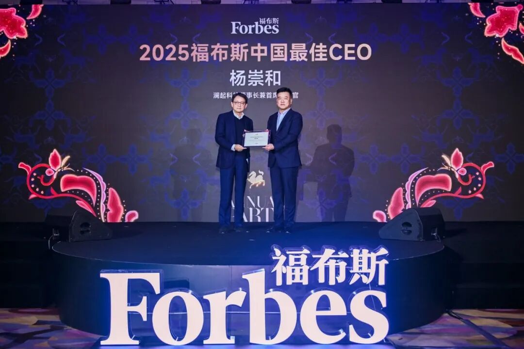 随后现场为澜起科技董事长兼首席执行官杨崇和及协创数据董事长兼首席执行官耿康铭颁发了“2025福布斯中国最佳CEO”奖项。