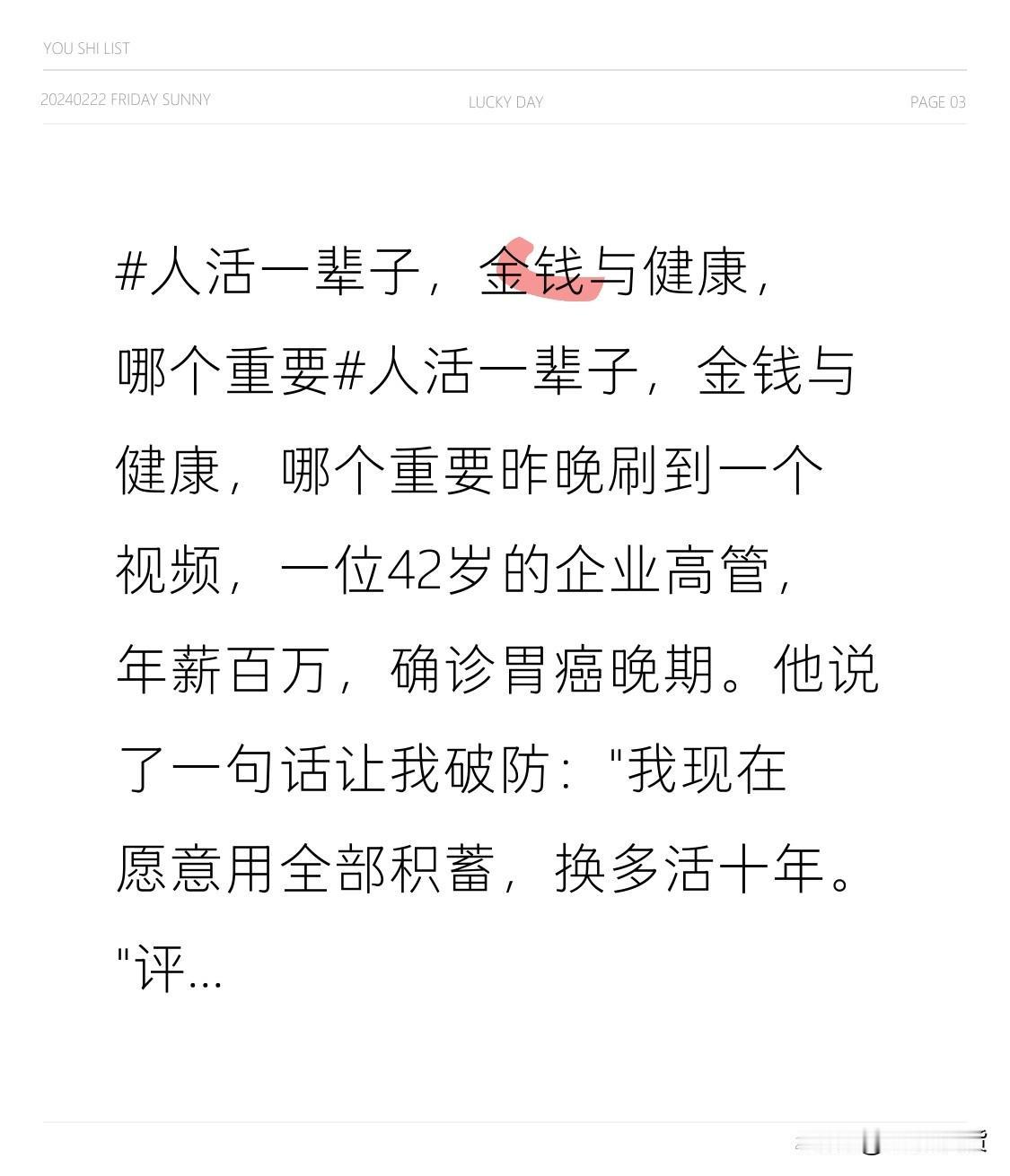 人活一辈子,金钱与健康,哪个重要 昨晚刷到一个视频,一位42岁的企业高管,年薪