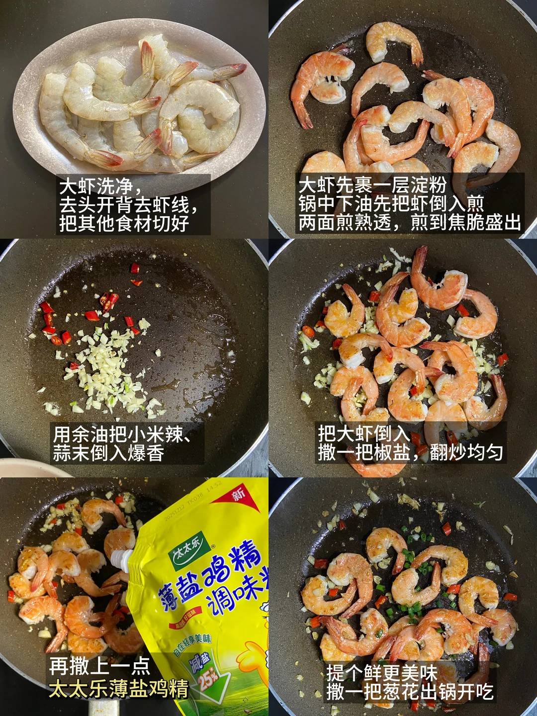3)用余油,把小米辣、蒜末倒入爆香,再把大虾倒入,撒一把椒盐,翻炒均匀,再撒上一点太太乐薄盐鸡精,提个鲜更美味