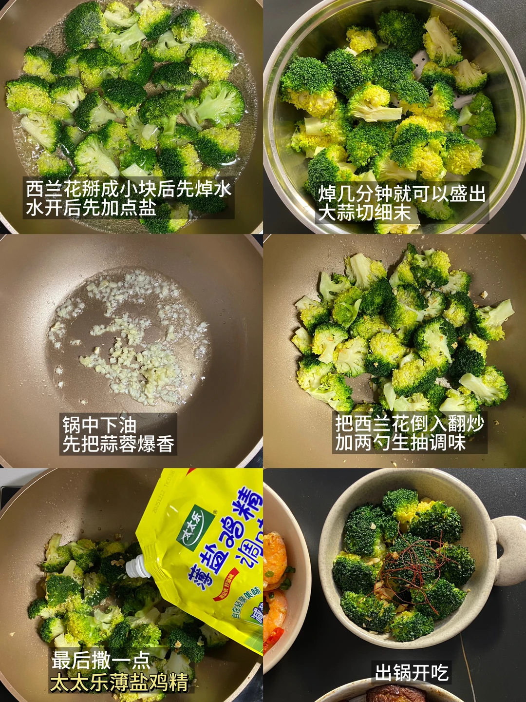 2)锅中下油,先把蒜蓉倒入爆香,再把西兰花倒入翻炒,加两勺生抽调味,最后撒一点太太乐薄盐鸡精,出锅开吃