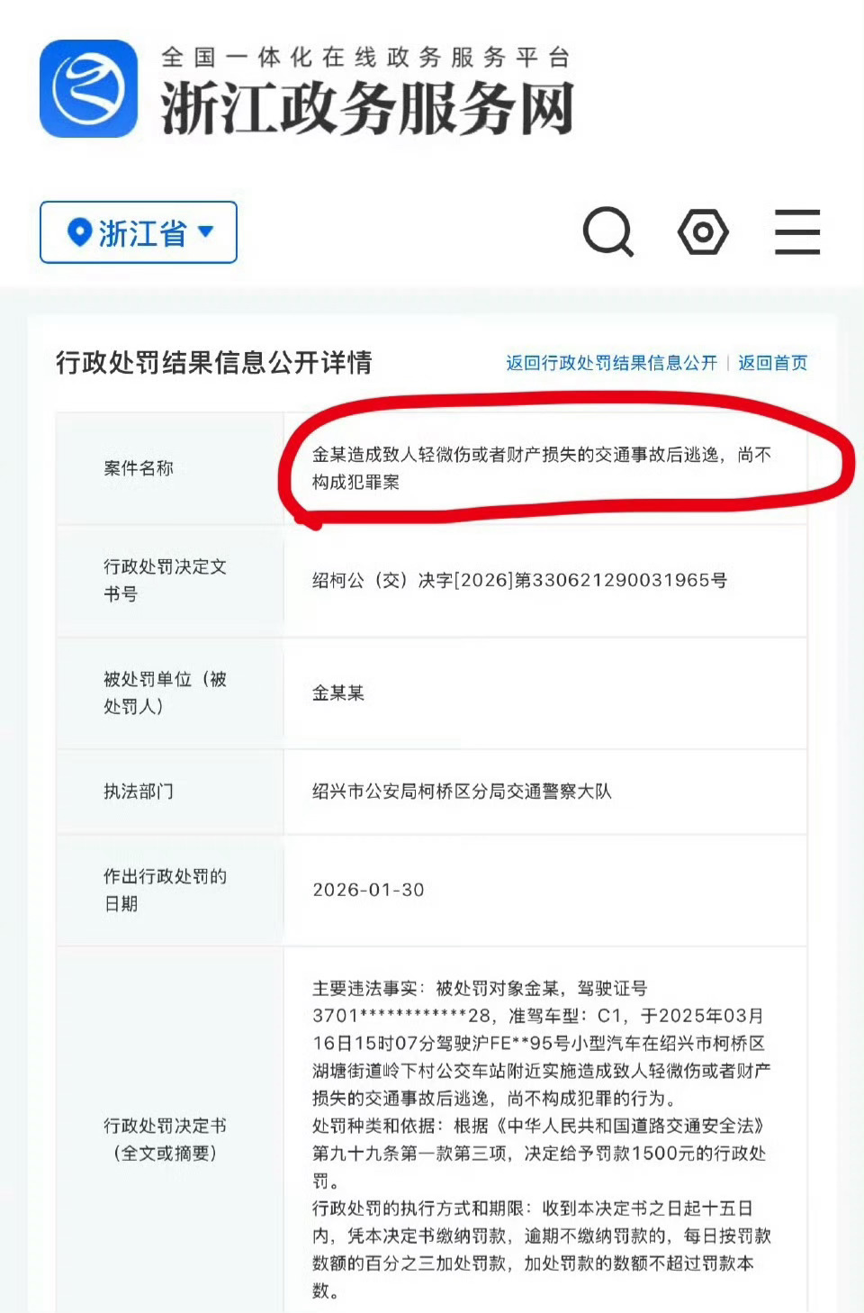 金晨肇事逃逸被罚1500元 金晨交通事故后逃逸被处罚,被判定为尚不构成犯罪,罚款