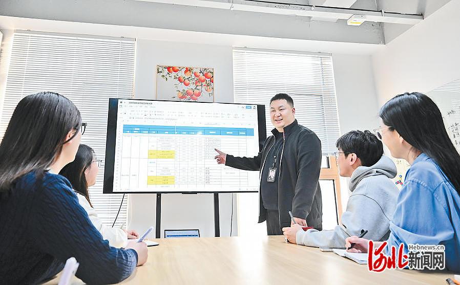 2月4日,谷聪(右三)在河北顺丰速运有限公司总部的一间会议室与同事交流工作。河北日报记者史晟全摄