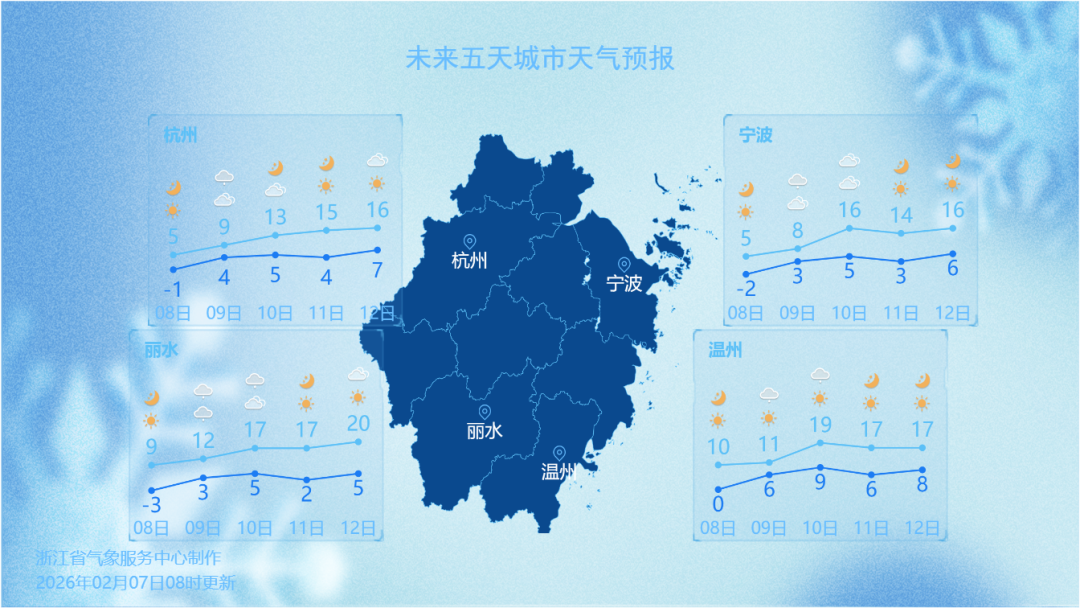绍兴市气象台2026年2月8日6:00发布的低温报告:受辐射降温影响,预计明天早晨最低气温-1~-3℃,有冰冻,山区-4~-6℃,有严重冰冻,请注意做好防寒保暖工作。短期天气预报:今天晴到多云,明天多云,夜里阴转小雨。偏北风明天转东南风2~3级。今天最高气温:5~6℃,比昨天偏高3℃左右;明天最低气温:-1~-3℃,有冰冻,山区-4~-6℃,有严重冰冻,比今天偏低2℃左右。后天多云转晴3~16℃。