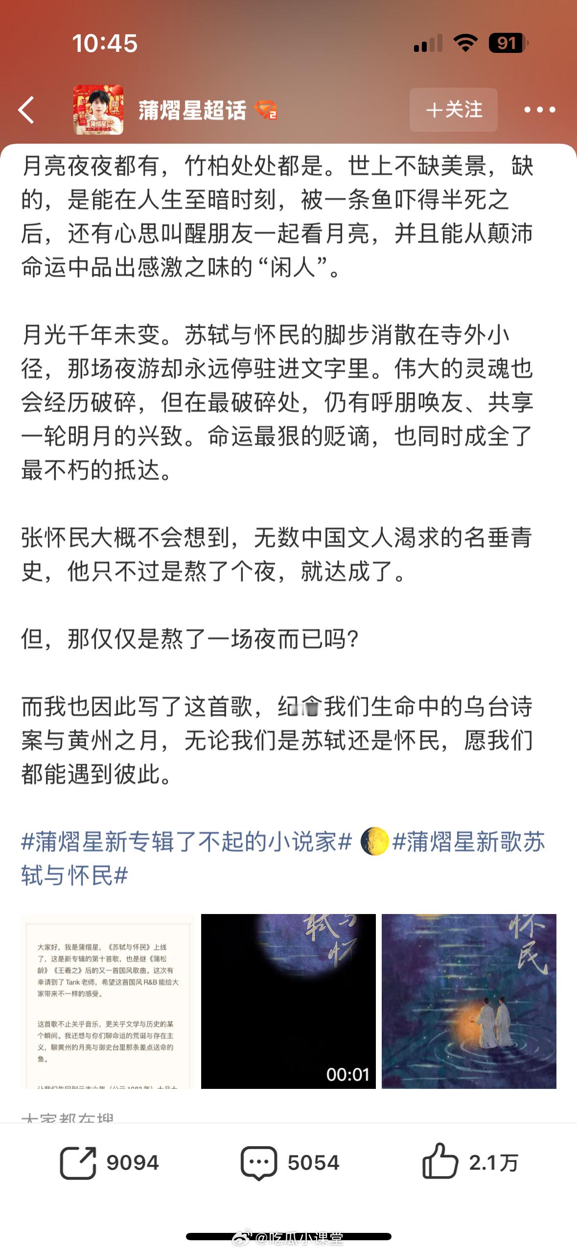 蒲熠星突然发现单条微博不能超2000字 为了安利新歌《苏轼与怀民》,阿蒲差点在微