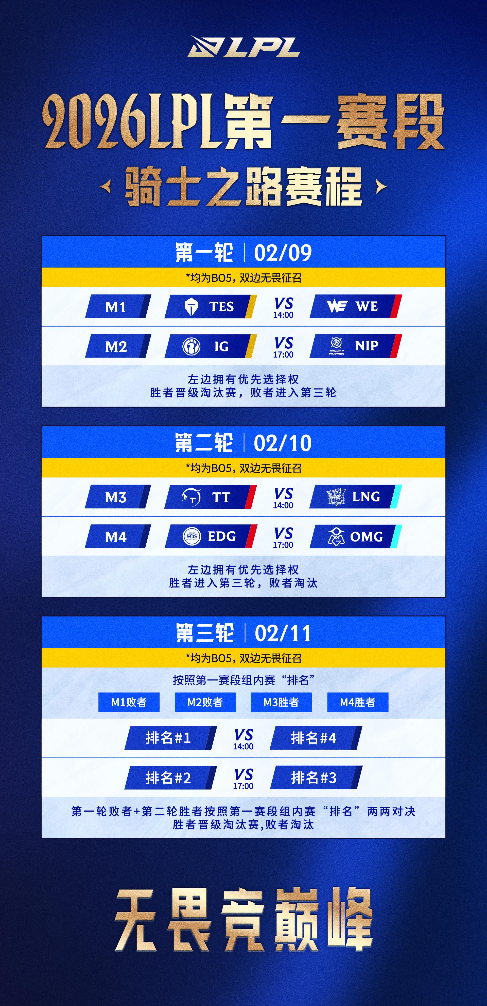 虎扑02月08日讯2026LPL第一赛段骑士之路将于2月9日开赛!本阶段分为三轮比赛,第一轮比赛由TES对战WE、IG对战NIP,其中登峰组两支队伍拥有优先选择权,双方进行双边无畏征召模式比赛(Bo5),胜者晋级淘汰赛,败者进入第三轮;