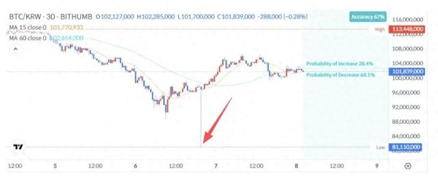 交易所数据显示,周五(6日)晚间Bithumb平台上的比特币价格一度从约9829万韩元(约67188美元)短暂下挫17%,跌至8110万韩元(约55400美元)。交易量随之飙升。