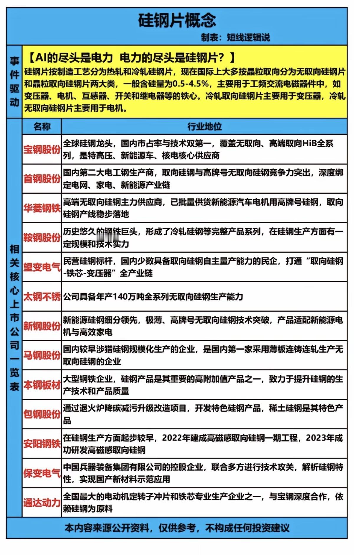 AI的尽头是电力!电力的尽头是硅钢片! 智能电网,变压器硅钢片,主要应用于电机核心部件。 相关核心龙头股: