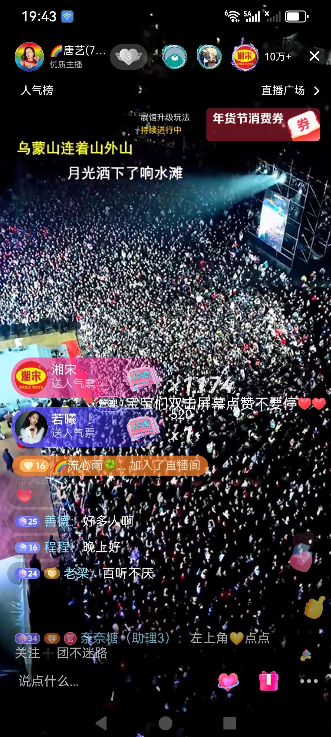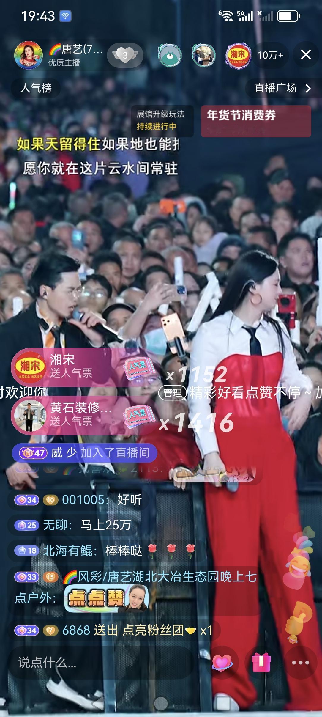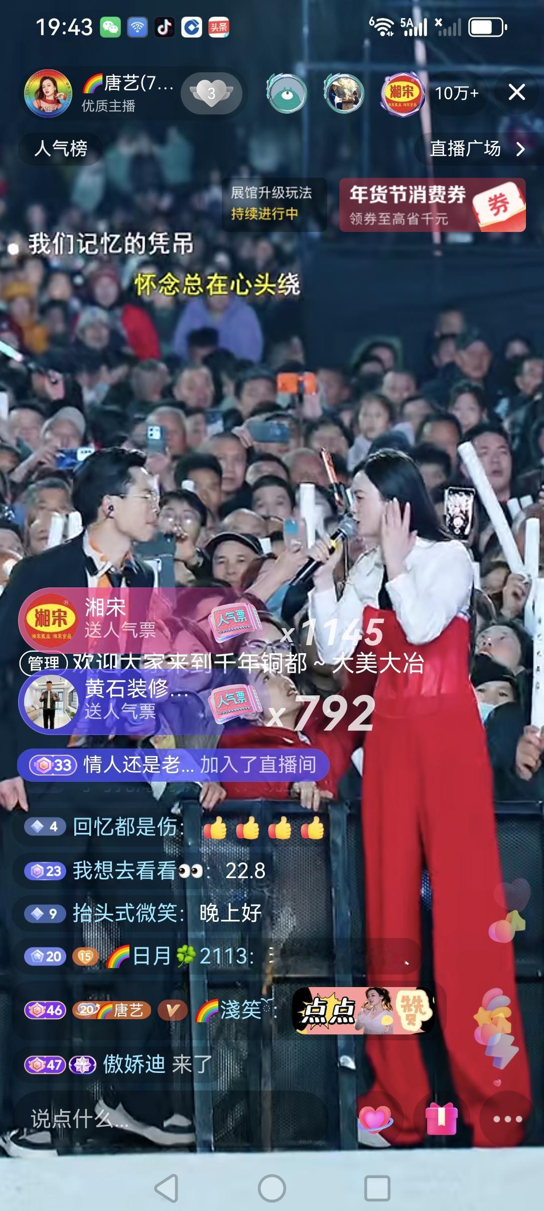 唐艺这两天的湖北大治站的活动,现场的观众太多了吧!可见湖北那边人们对唐艺的到来很热情。 昨天晚上直播了两个多小时,九点半不到点就下播了,昨天晚上当地的温度是零度左右,昨天湖北大冶是9到零下一度,还是很冷的。做户外直播活动还要看天气,当地的人们都很热情,唐艺说的她出去外面活动一个湖北,一个贵州两个地方的观众最热情最多。昨天也是几分钟直播间人气十万加,后面一直在二十万左右。 昨天晚上没有带货,她说的这次活动就是没有带货环节的,唐艺的坚持,为了迎合平台所做的改变,努力坚守为人,团队成员的合作等才有今天。希望她的这次活动圆满成功!