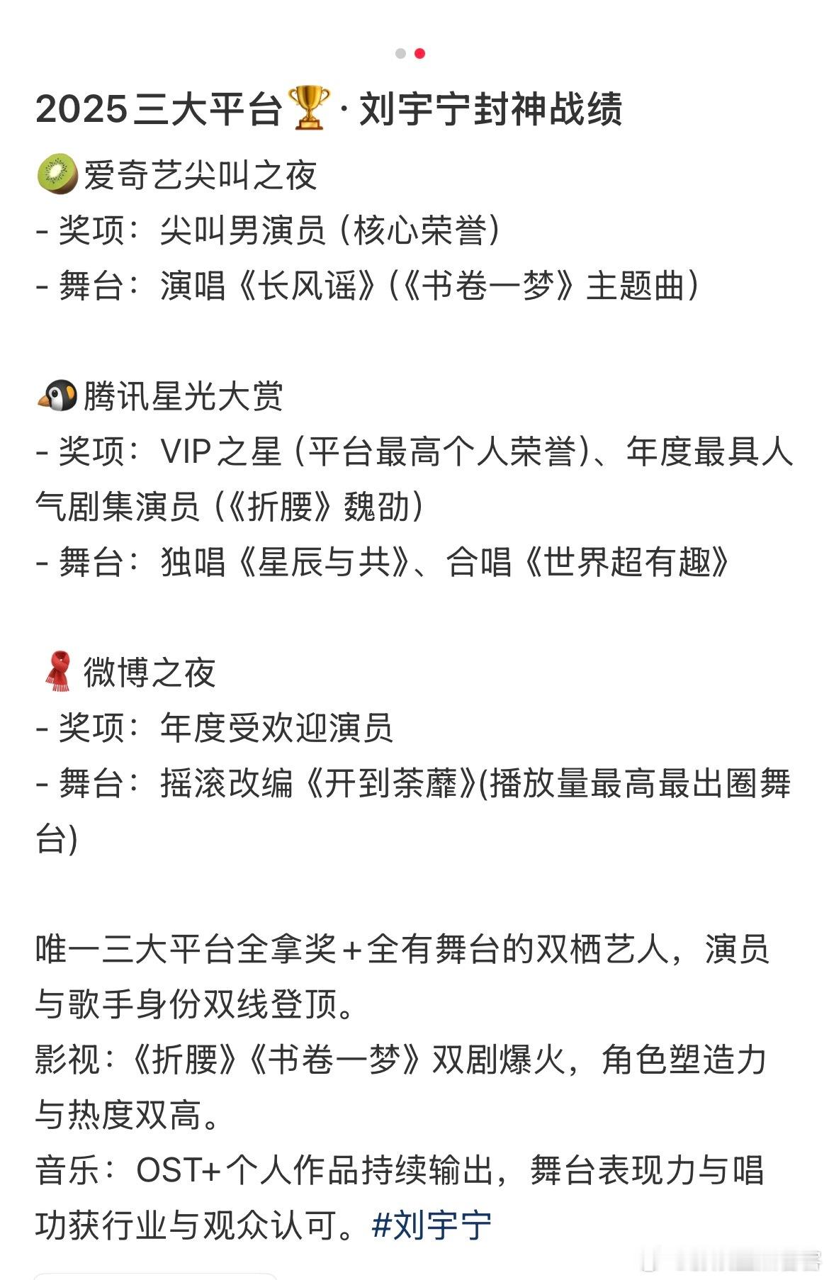 真的要给刘宇宁跪了🍠网友(小碗子cc)系统总结了‼️2025三大平台🏆·刘宇宁封神战绩‼️?谁不说一句顶刘🐮呢