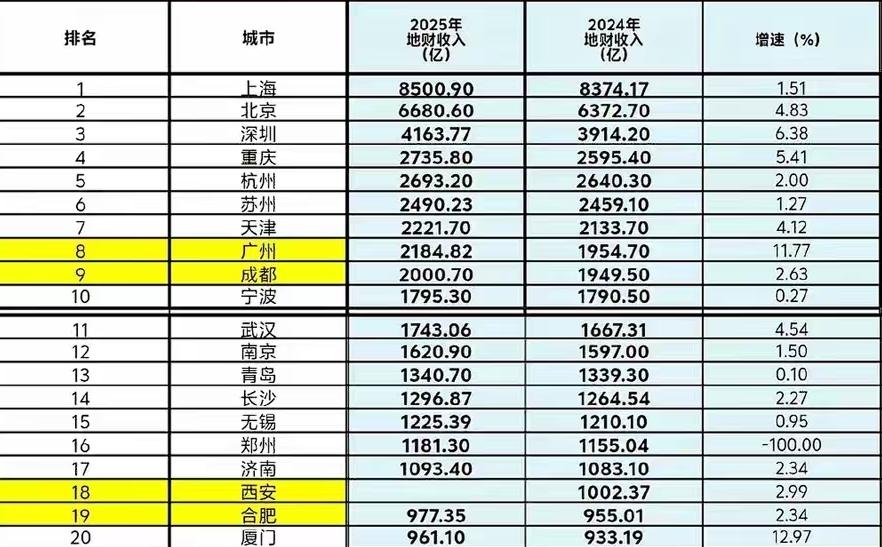 2025年地方财政收入20强城市出炉:深圳第三、长沙领先无锡 截止目前,我国地方财政收入20强城市已经全部确定出炉,其中上海和北京2025年1-12月地方财政收入分别完成8500.9亿和6680.6亿,位居全国前二名。 深圳是我国经济第三城,同时也是我国地方财政收入第三城,2025年地方财政收入完成4163.77亿,深圳既追上前面的上海和北京,同时后面的杭州苏州也追赶不上自己。 长沙和无锡2025年地方财政收入分别完成1296.87亿和1225.39亿,论经济总量,无锡领先于长沙,但论地方财政收入,长沙则领先无锡71.48亿。 合肥和厦门为地方财政收入20强城市中,唯二地方财政收入低于一千亿的城市,分别完成977.35亿和961.1亿,位居全国第19-20名。