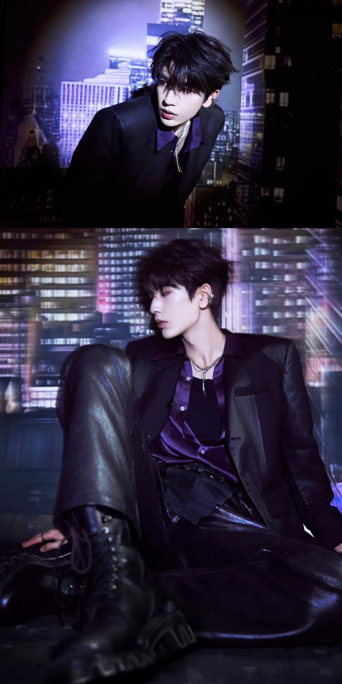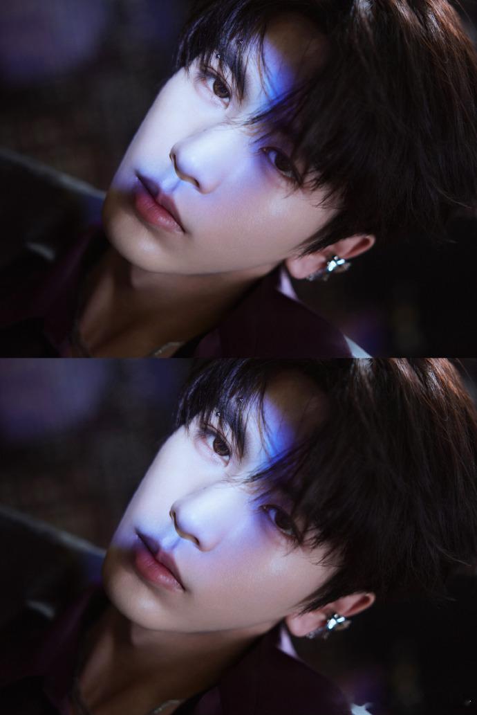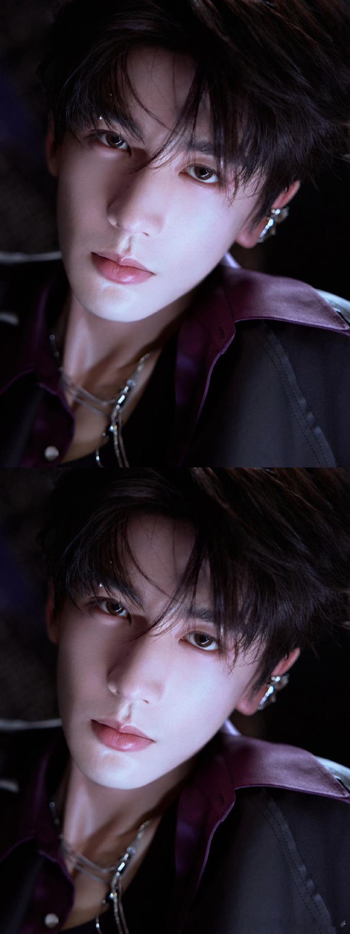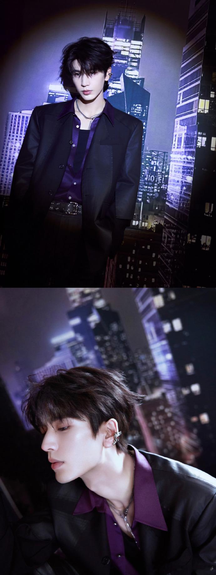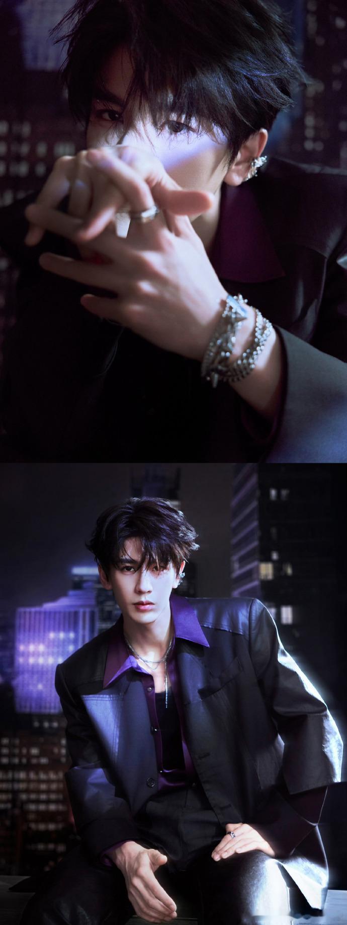 张凌赫戴了眉钉耳骨钉张凌赫和紫色的适配度 张凌赫这次的造型很有突破,紫色穿搭很有
