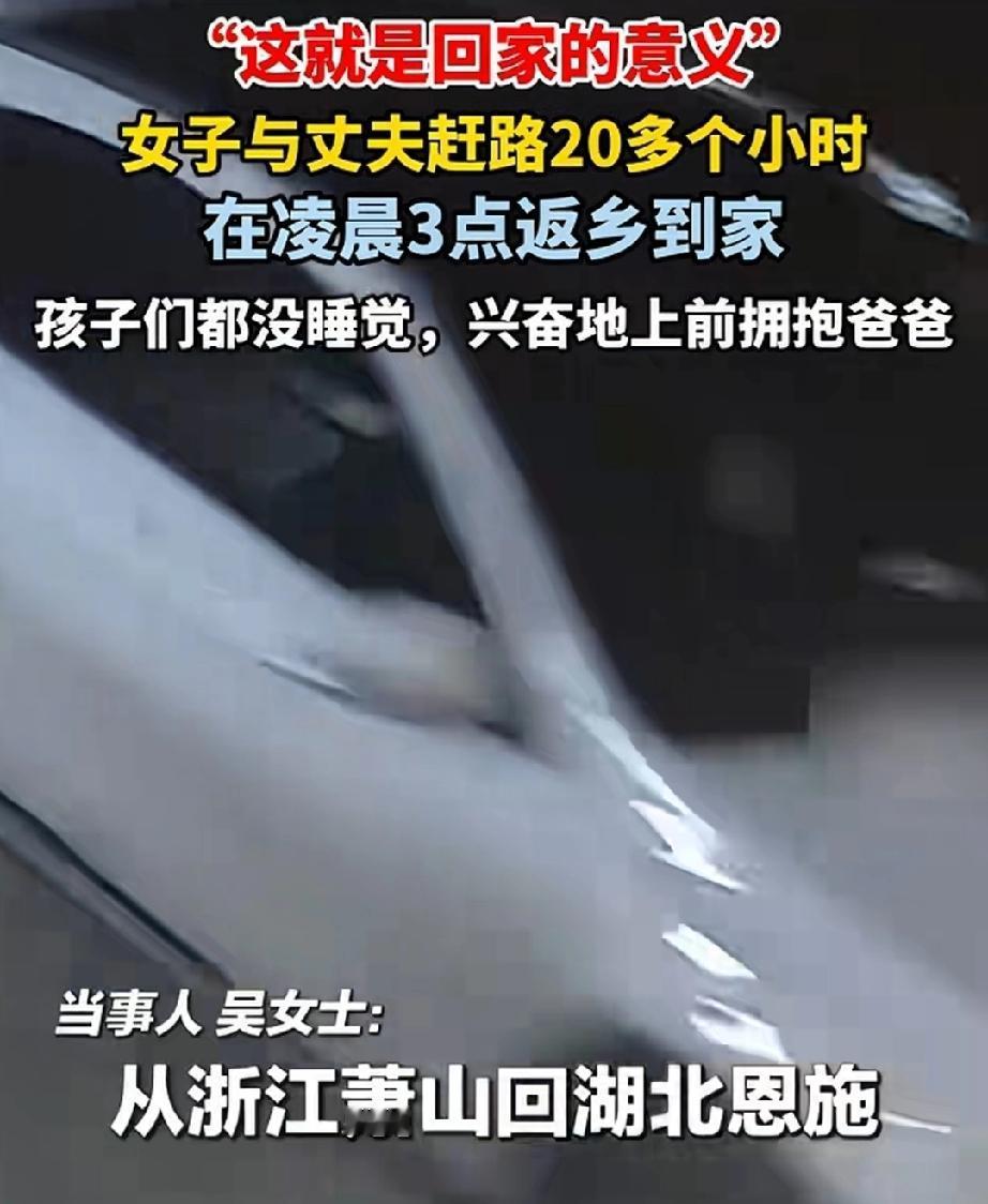 2月7日,湖北恩施。两个孩子得知父母要回家过年了,兴奋的不得了,觉也不睡了,一定要看爸爸妈妈回到家。 爷爷奶奶也很牵挂儿子儿媳,担心他们长途跋涉,可别累坏了,熬上排骨汤,给他们补一补。 夫妻俩人在浙江萧山打工,盼着早日回家过年,和家人团聚。俩人轮流驾驶汽车,人闲车不闲。日夜兼程,经过二十四小时,终于回到家了。 夫妻俩人凌晨三点到家,车还没到家门口,就看到屋里灯火通明,家人己在门口迎候。爸爸刚一下车,两个孩子就扑了上来,紧紧的拥抱,尽显思念之情。 故乡的情,故乡的爱,故乡的思念,这就是回家过年的意义。 夫妇凌晨3点返乡到家 孩子们等在门口回家过年 恩施过年