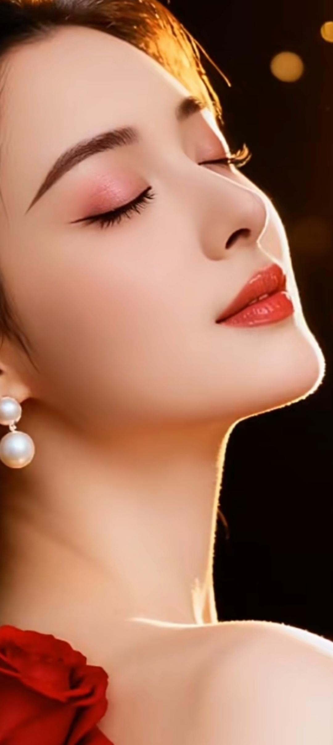 优雅红玫瑰,温柔闭眼妆,珍珠耳环闪耀,唯美瞬间定格