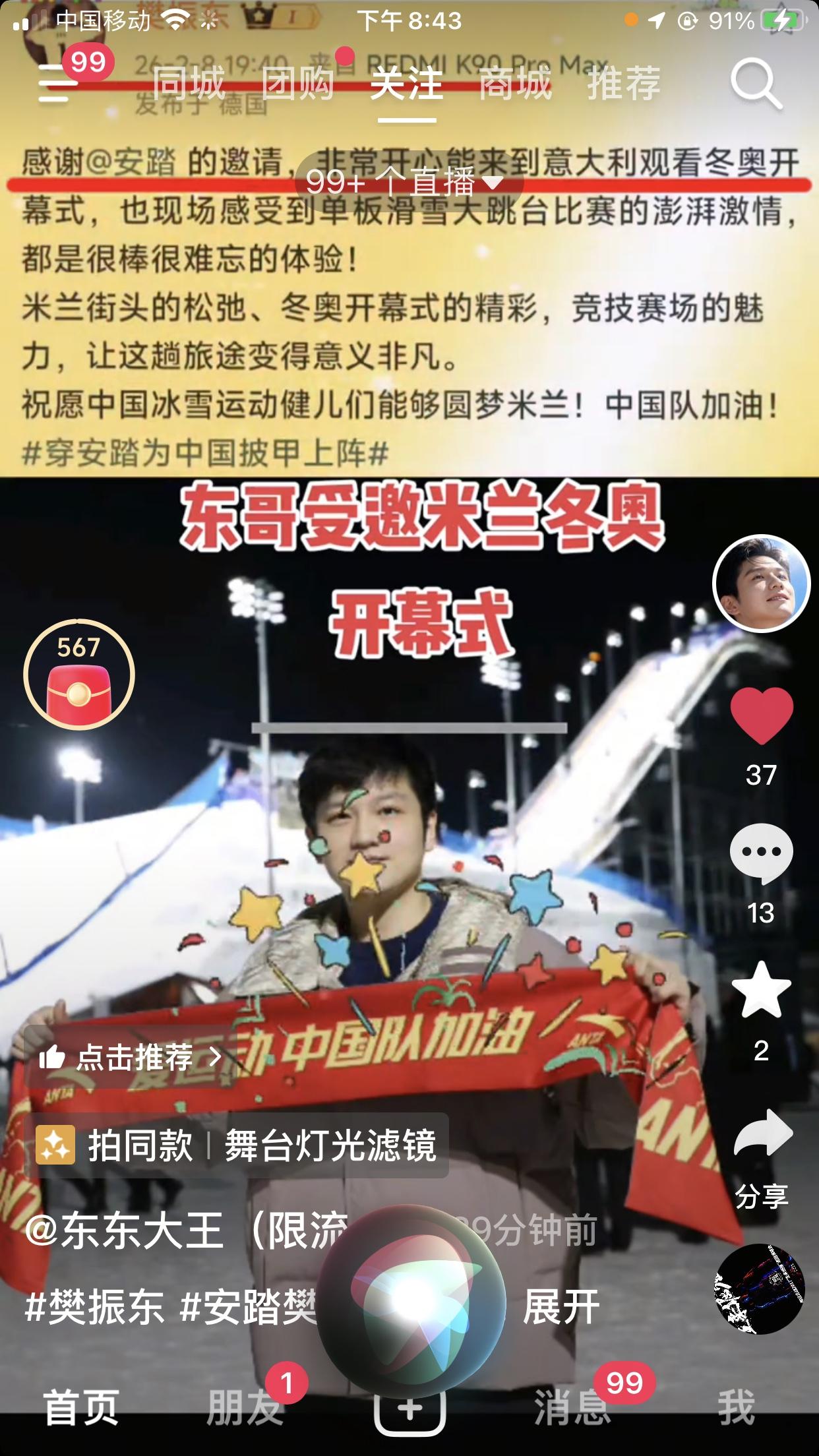 樊振东受邀参加意大利米兰冬奥开幕式。在现场感受到了单板滑雪大跳台的激情。 东哥也难得感受到了米兰街头的松驰,冬奥开幕式的精彩。 他预祝中国体育健儿取得好成绩。 最重要的是安踏的回复:穿安踏为中国披甲上阵。 感觉这可能也是东东难得的休闲时光吧。