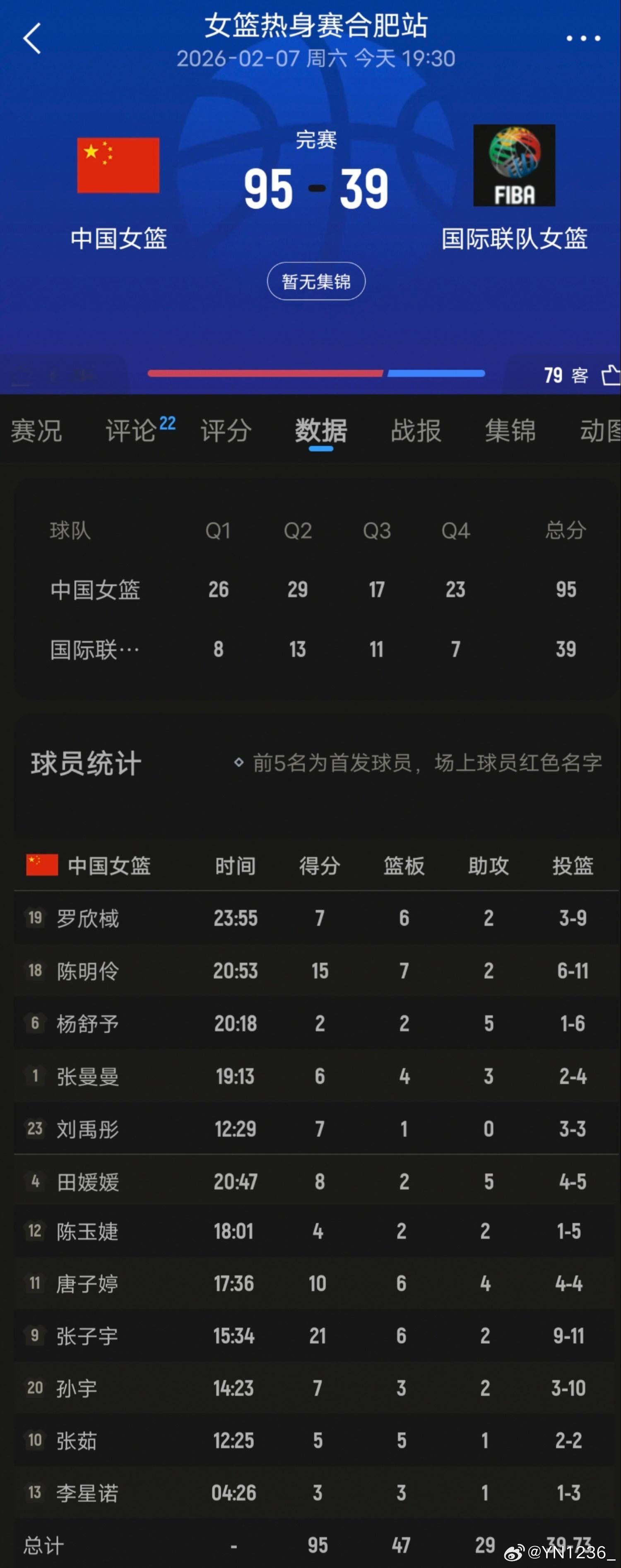 中国女篮合肥站热身赛: 中国女篮 95-39 国际女篮联队