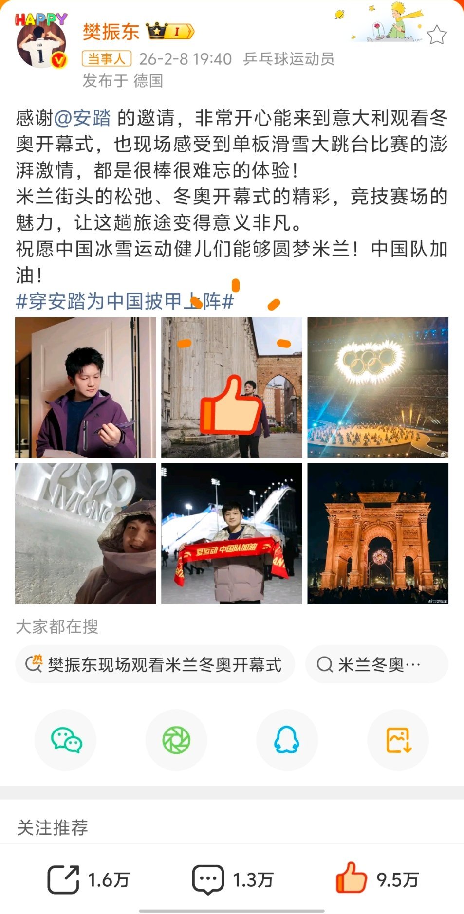 樊振东现身意大利看冬奥樊振东祝福中国冰雪健儿全民聊冬奥