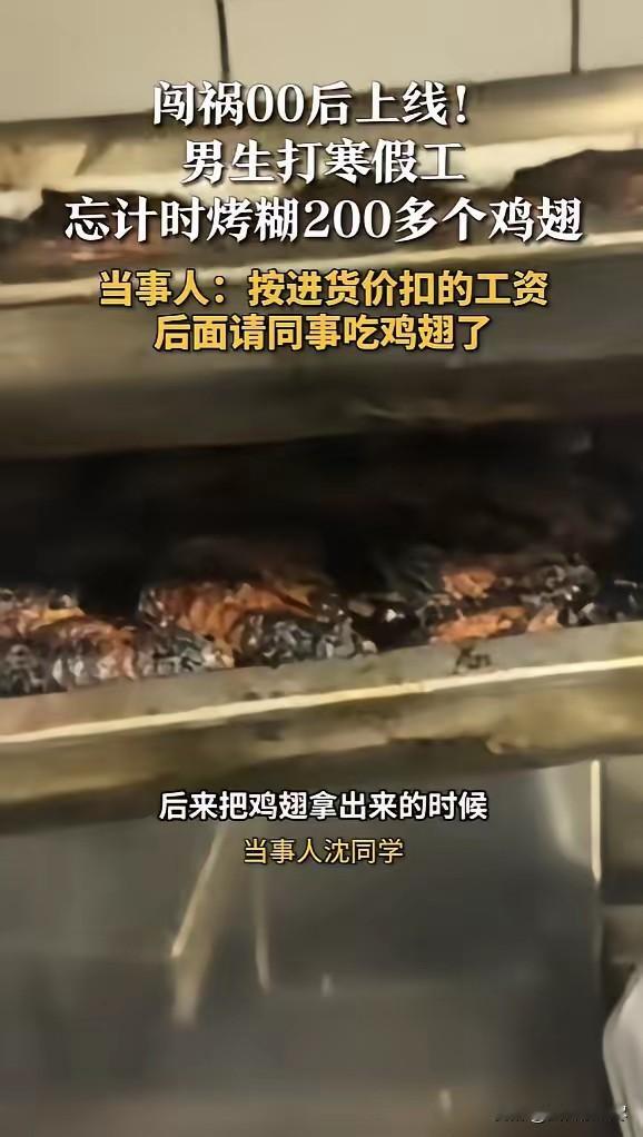 “闯大祸了!”近日,山东济南,一男生趁着寒假去打工,因为忘记计时,将200多个鸡翅烤糊,想着自己钱还没赚到,就要先搭进去不少,男生顿时觉得天塌了,后来这些鸡翅,也按进货从他工资里扣。网友:这教训太深刻了! 近日,山东济南一名00后男生的寒假打工经历在网络上引发热议,原本想利用假期勤工俭学赚点零花钱,却因为一次疏忽,让两百多个鸡翅全部烤糊,还没赚到钱就要先承担损失,男生坦言当时感觉天都要塌了,后续的处理方式也让网友们议论纷纷。 这名男生是一名在校大学生,趁着寒假时间,在当地一家餐饮店找了份后厨兼职,主要负责烤制食材,想着既能锻炼自己,又能靠双手赚点生活费。 事发当天正值用餐高峰,后厨里人来人往,备菜、出餐、打包的工作忙得不可开交,男生也跟着节奏加快了手上的动作,丝毫不敢懈怠。 按照工作流程,他将满满两大盘腌制好的鸡翅整齐摆放在烤盘里,送入烤箱后,本想顺手设置好计时器,却被同事喊去帮忙打包外卖订单,一来二去,就把计时的事情彻底抛在了脑后。 后厨的忙碌让他全程紧绷着神经,直到一股浓郁的焦糊味弥漫开来,他才猛然想起烤箱里的鸡翅,心里瞬间咯噔一下,慌忙放下手中的活计冲向烤箱。 当他颤抖着打开烤箱门时,眼前的景象让他彻底懵了,原本金黄鲜嫩的鸡翅已经变得焦黑发硬,表皮完全碳化,连骨头都透着焦色,根本无法再进行售卖。 他赶紧清点数量,发现足足有两百多个鸡翅全部报废,看着眼前堆积如山的烤糊鸡翅,男生的大脑一片空白,手心不停冒汗,想到自己还没开始赚钱,就要先赔偿食材损失,瞬间觉得天塌了,站在原地手足无措。 冷静下来后,男生没有选择逃避,而是主动找到老板坦白了自己的失误,做好了被严厉批评甚至辞退的准备。 老板查看完情况后,并没有过多指责,只是按照鸡翅的进货成本价格,从男生的工资里扣除了相应的费用,没有额外追加罚款,也没有辞退他,只是提醒他以后工作一定要细心,避免再出现类似的失误。 对于这样的处理结果,男生坦然接受,他知道是自己的疏忽造成了损失,承担责任是应该的。 为了不浪费食材,也为了表达对同事们的歉意,他将这些烤糊的鸡翅简单处理后,分给了后厨的同事们一起食用,用这样的方式化解了这次工作失误带来的尴尬。 这件事被分享到网络后,迅速吸引了大量网友的关注,大家纷纷发表自己的看法。有网友觉得这个教训太深刻了,年轻人第一次打工难免会犯错,这次经历也能让他记住工作的责任心; 还有网友调侃男生是“反向打工”,还没赚钱先赔钱,属实是大型翻车现场;也有网友称赞老板的处理方式很人性化,按成本扣款既让员工承担了责任,又没有过度苛责,很暖心; 还有网友表示,兼职岗位的岗前培训很重要,若是能提前强调操作规范,或许能避免这样的失误。 整个事件没有激烈的矛盾冲突,却真实反映了年轻人初入职场的青涩与成长,也让大家看到了职场中包容与责任并存的温暖一面。 对此,你们有什么看法,欢迎评论留言~