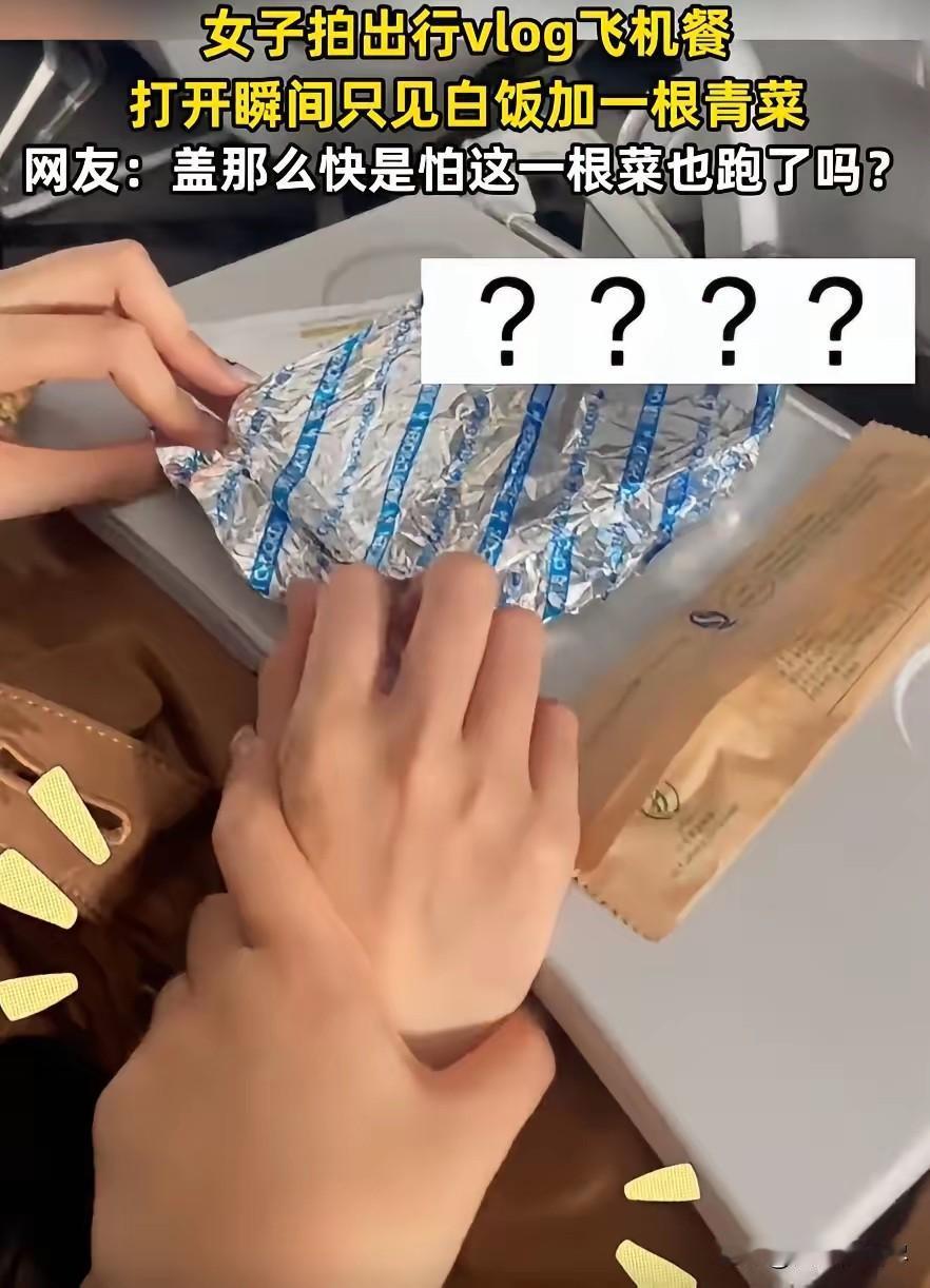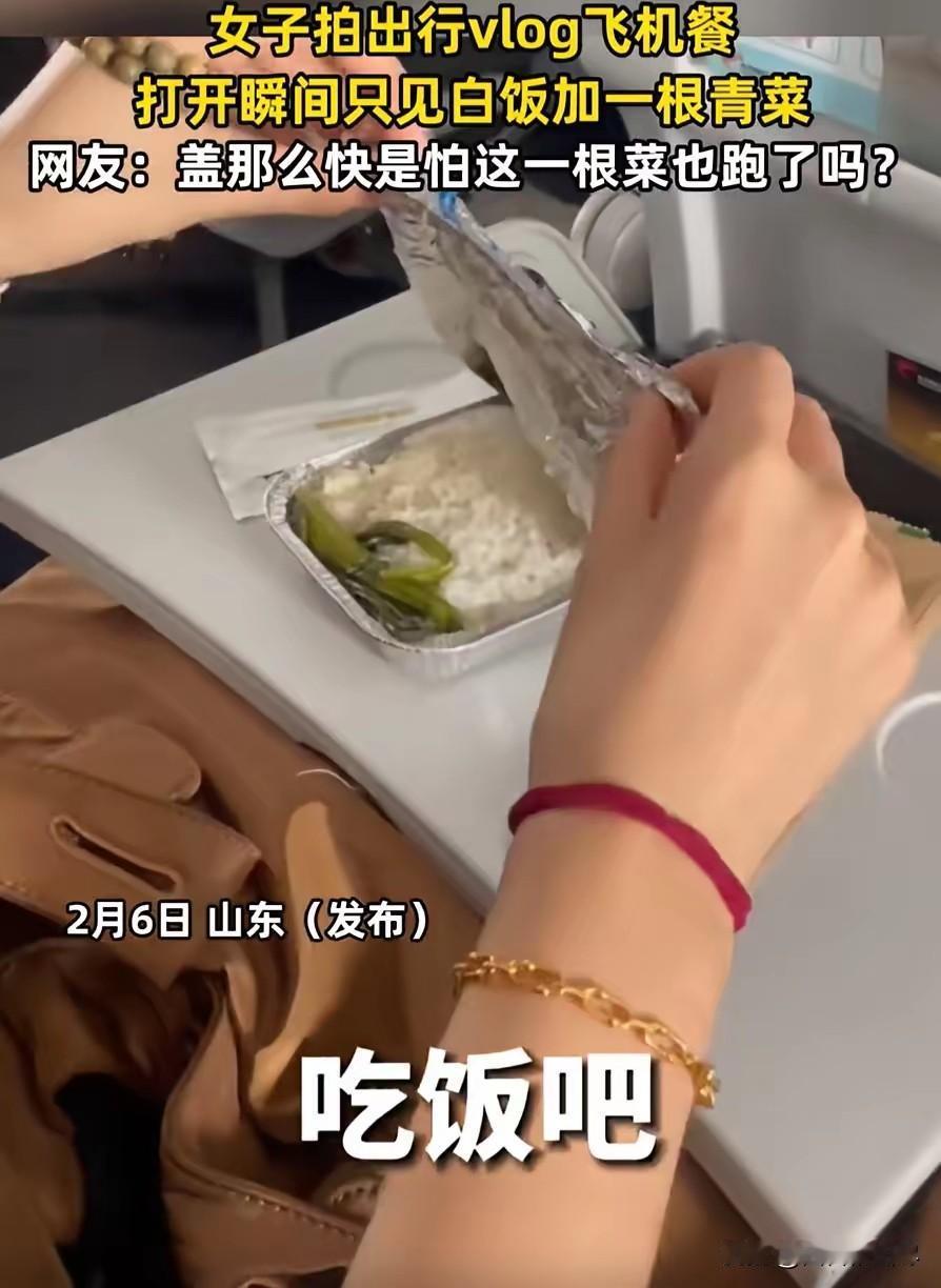 伤害性不高侮辱性极强!山东,一女子坐飞机出行,飞机起飞不久空姐就端上来飞机餐,万万没想到,女子把盖子打开一看,里面就只有一碗饭加一根青菜,吓得女子连忙盖上了盖子。网友:盖那么快是怕这一根菜也跑了吗? 2026年2月7日,山东一位女子乘坐国内航班出行,飞机平稳起飞后不久,空乘人员便推着餐车为乘客分发飞机餐,女子原本期待着能吃上一份热乎的餐食,缓解旅途的疲惫, 可当她接过餐盒打开盖子的那一刻,整个人都愣住了,随后下意识地快速合上了盖子,这一幕被她记录下来发布到网络,瞬间引发了网友的热议。 女子当时正坐在经济舱内,飞机进入平飞状态后,空乘按照流程依次发放餐食,她接过白色的餐盒时,还和身边的乘客闲聊着,满心期待着里面的饭菜。 可当她轻轻掀开餐盒的盖子,映入眼帘的只有一碗白米饭,米饭质地偏硬,旁边孤零零地躺着一根青菜,没有任何肉类、酱料,也没有其他配菜,整个餐盒显得格外空旷,极简的配置让她一时之间不敢相信自己的眼睛。 面对这样的飞机餐,女子的第一反应不是生气,而是觉得又好笑又无奈,她下意识地赶紧把盖子盖了回去,生怕动作慢一点,这唯一的一根青菜也会“消失”。 她坐在座位上反复确认了几次,餐盒里确实只有米饭和一根青菜,没有任何遗漏的配菜,同航班的其他乘客也陆续打开了餐盒,不少人看到自己的餐食后,也露出了和她一样错愕的表情,大家相视一笑,都被这极简的飞机餐配置逗乐了。 女子将自己打开餐盒的瞬间拍摄下来,配上简单的文字发布到社交平台,视频很快就火了起来,飞机餐仅一根青菜配米饭的话题迅速登上热搜,网友们的评论五花八门,充满了趣味。 有网友调侃道,女子盖盖子的速度也太快了,生怕这根青菜跑了,主打一个“伤害性不高,侮辱性极强”;还有网友戏称这是“空中辟谷套餐”,主打清淡养生,连油星都没有,减肥人士看了都得点赞; 也有网友分享自己的乘机经历,吐槽现在的飞机餐越来越敷衍,花了机票钱,却只能吃到这样的餐食,实在让人难以接受。 随着热度不断升高,当事人也出面进行了澄清,她表示自己当时是拍摄出行Vlog,因为只掀开了餐盒的一侧,没有注意到餐盒是双头设计,另一侧其实还有少量配菜,只是整体分量依旧偏少,并非真的只有一根青菜。 即便如此,网友们的讨论热情依旧不减,大家纷纷表示,就算有配菜,这样的配置也过于简单,航司在控制成本的同时,也应该兼顾乘客的基本用餐体验。 这场由一根青菜引发的热议,不仅让大家感受到了旅途趣事的欢乐,也让人们关注到了民航餐食的配置问题,成为了网络上一段轻松又有趣的小插曲。 对此,你们有什么看法,欢迎评论留言~