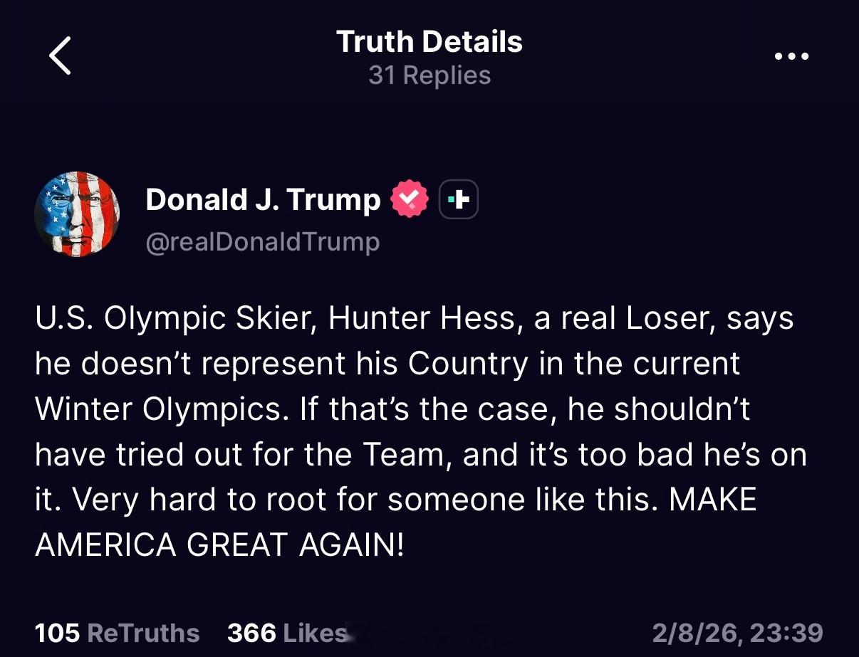特朗普强烈谴责美国滑雪运动员亨特赫斯