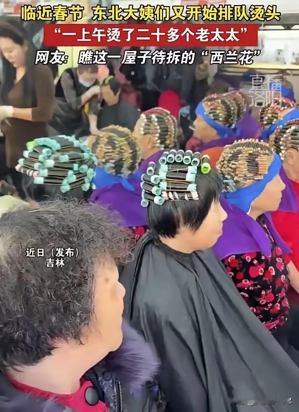 笑不活了!吉林,一位理发店老板在网上吐槽,临近过年老太太们都出来烫头发了,仅仅一上午的功夫就烫了二十多个老太太,根本忙不过来,网友:一屋子待拆的“西蓝花”。 2026年2月初,吉林一家理发店的日常被网友拍成视频发到网上,瞬间引发全网爆笑。临近春节,当地的中老年阿姨们扎堆来烫头,老板忙得脚不沾地,仅仅一上午就接待了二十多位顾客,店里坐满了顶着卷发杠的阿姨,被网友调侃成一屋子待拆的“西蓝花”,场面热闹又喜庆。 这家理发店开在居民区附近,平日里生意就不错,一到腊月就迎来了全年最忙碌的时段。 从早上七点开门起,店里就坐满了等候的阿姨,有的自带保温杯,有的和老姐妹唠着家常,队伍从店内一直排到门口, 玻璃门上贴着的“春节不打烊”红幅,被热气熏得微微发皱,空气中混合着烫发药水的味道和欢声笑语,年味十足。 老板和几位理发师分工协作,有人负责卷杠子,有人操作加热设备,有人打理定型,每个人的手都停不下来。 卷杠子的动作快得像流水线,手指翻飞间,一个个卷发杠整齐地固定在头发上,加热设备嗡嗡作响,整个店面被忙碌的氛围填满。 老板坦言,从早忙到晚连喝水的时间都没有,胳膊酸得抬不起来,一上午烫完二十多位阿姨,是这段时间的常态。 店内的座位上,阿姨们顶着五颜六色的卷发杠,一排排整齐排列,从远处看就像一颗颗饱满的西蓝花,等待着拆杠定型。 她们一边等待,一边聊着过年的安排、走亲戚的计划,偶尔还会互相点评发型,气氛轻松又融洽。 有的阿姨特意提前预约,就为了赶在年前烫个新发型,在她们心里,过年烫头是必不可少的仪式感,头发支棱起来,年才算过得圆满。 这段视频被发布到网络后,一屋子待拆的西蓝花话题迅速登上热搜,网友们的评论充满趣味。 有人调侃理发店像蔬菜大棚,满屋子都是即将成熟的“西蓝花”,老板这是在搞批量生产;有人表示东北大姨的过年仪式感太足,不烫头都不好意思走亲戚; 还有网友分享自家长辈的经历,说妈妈和奶奶每年都要烫同款发型,这是刻在骨子里的年味。 也有网友心疼理发师的辛苦,说高强度的工作堪比春运,一上午二十多个顾客,手都要磨出茧子; 还有人觉得这种热闹的场景特别治愈,平凡的生活里藏着最真实的年味,阿姨们对美的追求和对新年的期待,让人觉得温暖又可爱。 这场热闹的烫头热潮,没有华丽的装饰,没有刻意的安排,只是普通人迎接新年最朴素的方式,却成为了网络上最有趣的年味名场面,也让大家感受到了东北春节独有的烟火气。 对此,你们有什么看法,欢迎评论留言~