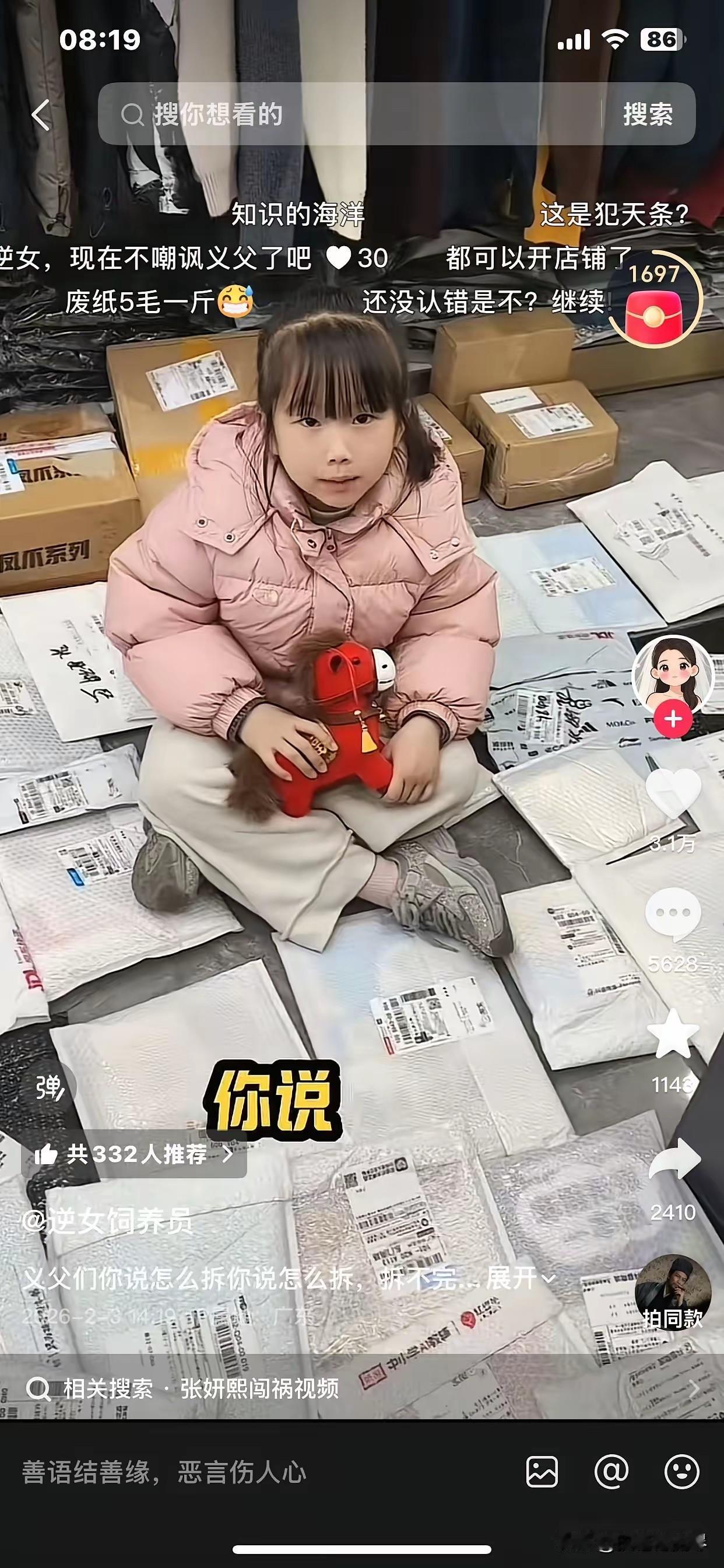 广东六岁女孩张妍熙喊话义父,义父放假了,很闲的那种!这帮义父怎么能让电子女儿过个这么闲的寒假? ​于是,全国各地的义父不约而同的给电子女儿邮去了作业本,练习册,寒假作业,从一年级到六年级的。 2026年2月初,广东清远6岁女孩张妍熙的一段视频在网络上迅速走红,她也因此被网友称作2026年第三个“惹祸”的人。 这个可爱的小姑娘凭借三个抖音账号,在全网收获了近四十万“义父”粉丝,平日里靠着甜甜的语气和暖心的互动,把一众网友哄得十分开心,却没想到一句寒假喊话,让自己的悠闲假期彻底泡汤。 张妍熙的日常视频风格轻松可爱,每天都会在账号上和义父们聊天报平安,分享自己的生活小事,一句句暖心的问候拉近了和网友的距离,也让她收获了大批忠实的粉丝。 寒假来临后,小姑娘满心欢喜地对着镜头喊话,直言自己已经放假,日子过得十分清闲,还俏皮地调侃义父们,这份无忧无虑的模样,瞬间点燃了全网义父的“整活”热情。 网友们顺着她往期视频里露出的快递面单信息,找到了她父母经营的服装店地址,一场跨越全国的“作业投喂”行动就此展开。 从1月30日开始,快递员便频繁上门派送包裹,起初只是零星的练习册,到后来包裹越堆越多,直接在店铺里堆成了小山,拆快递的速度远远赶不上派送的速度。 全国各地的义父们纷纷出手,福建网友寄来了《口算天天练10000题》和练字帖,湖北网友送上一年级下册黄冈密卷,山东网友一次性寄出三本寒假作业,还有网友贴心附上戒尺,备注要督促孩子好好学习。 除了小学一到六年级的语数外练习册、试卷,更有网友寄来了《民法典》、公务员考试教材、法语入门书,甚至还有风水、国学类书籍,把从小学到成年的学习资料都安排得明明白白。 张妍熙每天都要面对堆积如山的包裹,拆快递拆到麻木,看着眼前数不清的作业本和练习册,原本开心的小脸瞬间垮了下来,再也没有了之前炫耀假期清闲的得意。 她的母亲许女士表示,收到的作业种类繁多,数量庞大,根本无法全部完成,只能每天安排孩子做适量的习题,剩下的会整理后分给身边的同学,避免资源浪费。 除了作业,不少义父还寄来了各地特产、零食和玩具,把小姑娘的年货提前备齐,有网友甚至寄来了鹦鹉,让这场充满趣味的互动多了更多惊喜。 张妍熙看着眼前的一切,无奈又可爱地对着镜头吐槽,拆不完的快递和做不完的作业,让她彻底体会到了“祸从口出”的滋味。 这件事在网络上引发了热烈讨论,网友们纷纷被这场有趣的互动逗笑,有人调侃义父们的操作太硬核,用最温柔的方式给了小姑娘最“扎心”的关爱; 也有人觉得这场互动充满了网络温情,成年人用幽默的方式回应孩子的俏皮,治愈了彼此的生活;还有网友表示,这是互联网独有的善意,没有恶意,只有满满的欢乐与温暖。 对此,你们有什么看法,欢迎评论留言~