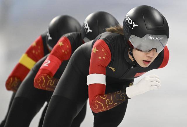 新华社照片,哈尔滨,2025年2月11日2月11日,中国队选手杨滨瑜、阿合娜尔·阿达克、韩梅(从右到左)在比赛中。当日,第九届亚冬会速度滑冰女子团体追逐决赛在哈尔滨举行。中国队夺得冠军。新华社记者陈振海摄