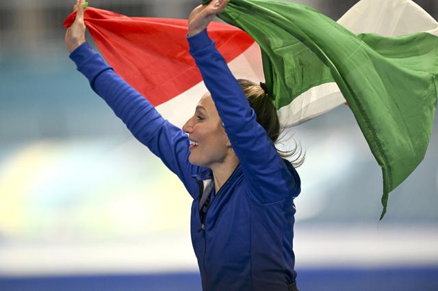 新华社照片,米兰(意大利),2026年2月7日2月7日,冠军意大利选手洛洛布里吉达在比赛后庆祝。当地时间2月7日,米兰-科尔蒂纳冬奥会速度滑冰女子3000米决赛在意大利米兰举行。新华社记者武巍摄