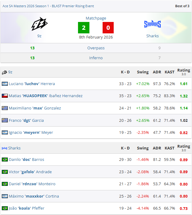 9z在2026赛季前对阵容进行大幅调整,引入了Luciano"⁠luchov⁠"Herrera、Ignacio"⁠meyern⁠"Meyer和Franco"⁠dgt⁠"Garcia,其焕然一新的阵容已初显成效。在通过公开预选赛后,9z先后战胜GaiminGladiators、Imperial和Sharks,赢得AceSAMasters第一赛季冠军,从而锁定BLASTOpen席位。