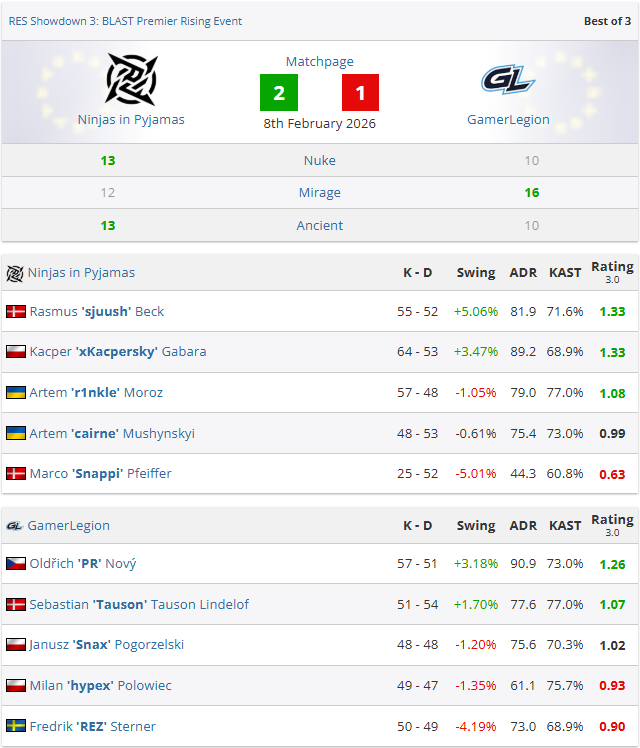 NiP几乎错失晋级机会:他们在对阵GamerLegion时顺利拿下首图,却在第二图以12-8领先的情况下被对手逆转,以12-16告负。在决胜图远古遗迹上,NiP上半场强势取得9-3领先,尽管下半场GamerLegion顽强反扑,仍凭借足够的优势空间以2-1锁定胜利。