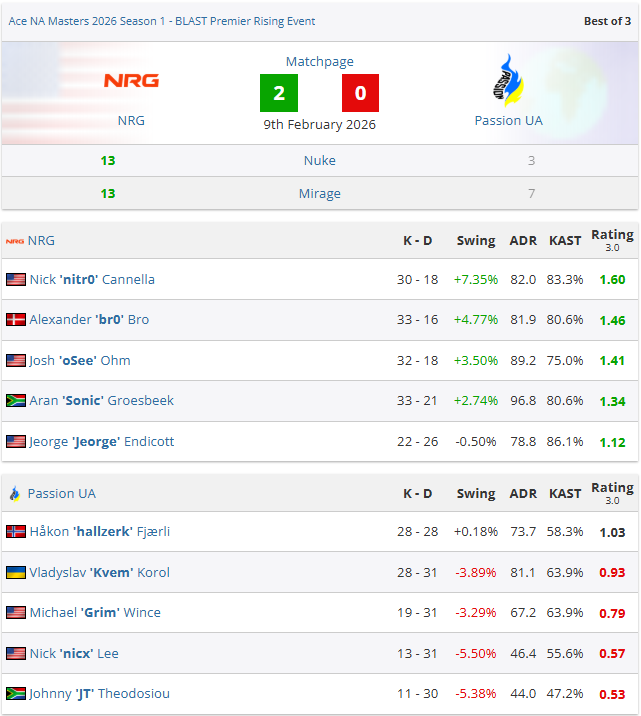 NRG参加的AceNAMasters第一赛季,是他们重新启用狙击手Josh"⁠oSee⁠"Ohm后的第四项赛事。此前他们经历了一月密集的赛程,包括两项本地线下赛及IEM克拉科夫站。