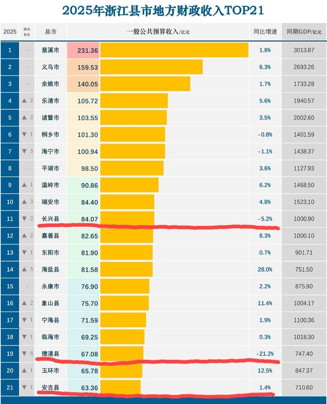 湖州市下面三个县2025年财政收入:长兴同比减少了5.2%、德清同比减少了21.2%、安吉同比增长了1.4%。 湖州这三个县也是废掉了,行政事业编制人员估计要过几年苦日子了?我猜湖州下面两个区也好不到哪里去! 这里面,不得不说一下德清,这么好的地理位置,原来发展多么的好。遥想上世纪末,湖州第一个上市公司就出在德清,一个镇上面连续出了两个全国rd代表,德清经济在整个湖州遥遥领先,把长兴安吉远远的甩在后面,可现在呢,连长兴的屁股都快看不到了!