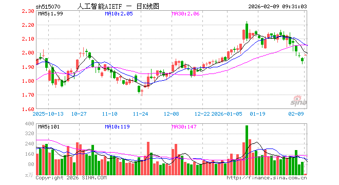 2月9日,人工智能AIETF(515070)开盘涨2.11%,报1.980元。人工智能AIETF(515070)重仓股方面,中际旭创开盘涨3.89%,新易盛涨4.37%,寒武纪涨2.22%,澜起科技涨4.49%,中科曙光涨3.70%,科大讯飞涨1.72%,海康威视涨0.49%,豪威集团涨1.20%,金山办公涨1.38%,浪潮信息涨2.32%。