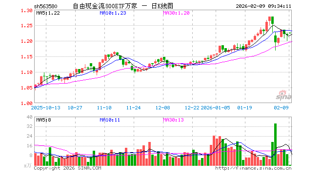 2月9日,自由现金流800ETF万家(563580)开盘涨0.66%,报1.226元。自由现金流800ETF万家(563580)重仓股方面,中国海油开盘跌0.29%,上汽集团涨0.55%,格力电器涨0.13%,中远海控涨0.07%,牧原股份跌0.54%,中国铝业涨1.78%,TCL科技涨1.02%,宝钢股份涨0.99%,长城汽车涨0.14%,正泰电器涨1.10%。