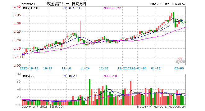 2月9日,自由现金流ETF基金(159233)开盘涨0.62%,报1.308元。自由现金流ETF基金(159233)重仓股方面,中国海油开盘跌0.29%,上汽集团涨0.55%,格力电器涨0.13%,中远海控涨0.07%,牧原股份跌0.54%,中国铝业涨1.78%,TCL科技涨1.02%,宝钢股份涨0.99%,长城汽车涨0.14%,正泰电器涨1.10%。