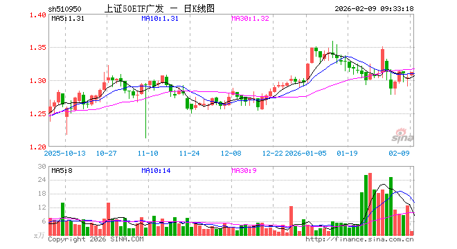 2月9日,上证50ETF广发(510950)开盘涨0.23%,报1.307元。上证50ETF广发(510950)重仓股方面,贵州茅台开盘涨0.20%,中国平安涨0.82%,紫金矿业涨3.50%,招商银行涨0.00%,兴业银行涨0.00%,长江电力涨0.04%,寒武纪涨2.22%,中信证券涨0.50%,恒瑞医药涨0.77%,工商银行跌0.14%。