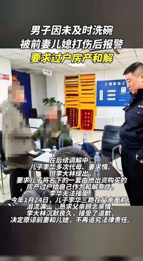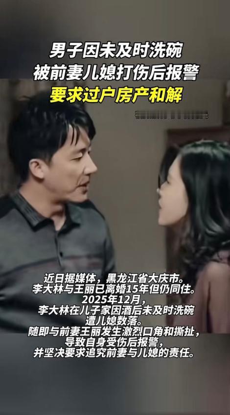 “太狗血!”黑龙江大庆,男子和前妻离婚15年,为了帮带孙子,俩人仍住一起,谁料,就因为男子酒后没及时洗碗,竟被前妻和儿媳又骂又打,男子挂了彩,气得直接报警,要追究2人的责任,儿子坐不住了,求他高抬贵手,放过母亲和妻子,男子却提出条件,要求儿子把名下唯一一套房子过户给他,儿子不同意,给男子下跪3次求原谅,结局亮了。   黑龙江大庆这场家庭闹剧,说出来没人不唏嘘:离婚15年的前夫前妻没各走各路,反倒为了帮带孙子挤在一起。   本以为是亲情加持,没想到一顿酒、几个没洗的碗,竟闹到报警追责、儿子下跪的地步,而最后的结局,看似意外却又在情理之中。   当事人李大林和王丽,离婚15年却始终“离婚不离家”,说白了,都是为了儿子李华和年幼的孙子,两人放下过往恩怨,凑在儿子家里搭把手。   平时虽有零星摩擦,也都靠着“看在孙子面子上”忍了下来,谁也没料到,矛盾会因一件鸡毛蒜皮的小事彻底爆发。   去年12月底的一天晚上,李大林到儿子家看孙子,顺便和王丽商量给孙子拿生活费的事。   饿了的他喝了罐啤酒、简单吃了点东西,酒劲上来有些犯困,就坐到沙发上休息,没及时把碗筷收拾清洗。   这点疏忽,彻底点燃了导火索,儿媳见状心生不满,絮絮叨叨数落起来,本就酒后情绪易激动的李大林也来了脾气,两人你一言我一语吵了起来。   正在卧室的王丽闻声而出,没有半句劝解,反倒站在儿媳一边指责辱骂李大林,说着说着还动了手,拽住李大林的衣领不放,儿媳也上前拉扯,混乱中李大林的前胸被抓伤,实实在在挂了彩。   又疼又寒心的李大林,气得当场报了警,态度坚决要追究前妻和儿媳的责任,半点商量的余地都没有。   民警赶到后,考虑到是家庭内部纠纷,便组织双方调解,可李大林气难平,怎么都不肯松口。   最为难的莫过于儿子李华,一边是生养自己、受了委屈的父亲,一边是朝夕相处的母亲和妻子,夹在中间的他左右不是人。   为了保住家人,李华多次替母亲和妻子求情,可李大林不为所动,还抛出了一个让人意外的条件:让李华把名下唯一一套房子过户给自己,否则绝不谅解。   这套房子本是李大林出资购买,只是登记在儿子名下,可对李华来说,这是一家人唯一的住处,根本无法答应。   今年1月下旬,调解现场,走投无路的李华当着父亲的面,三次重重跪下,泪流满面恳求父亲顾念亲情,放过母亲和妻子。   看着儿子放下尊严苦苦哀求的模样,李大林沉默了许久,终究是血脉亲情战胜了心中的怨气,他缓缓扶起儿子,撤销了追责诉求,也不再提房产过户的事。   一场因洗碗引发的闹剧,闹了近一个月,最终以亲情收场,没有赢家,却也守住了一家人最后的体面。