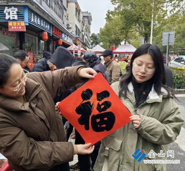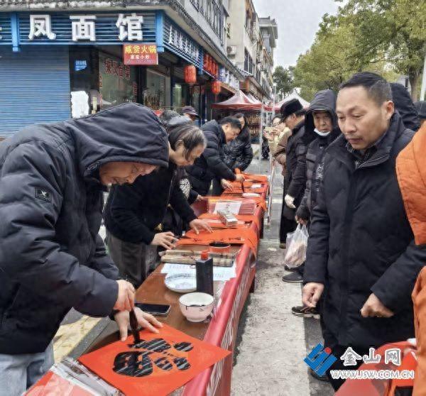 金山网讯2月7日上午,宝堰镇农贸市场旁人群涌动、红火热闹。宝堰画院的卞美岗、赵金才、谷洪、马军、吴煜明五位书法家铺展红纸、添墨挥毫,为乡亲们现场书写春联与福字。墨香扑鼻,笔走龙蛇,一副副春联在行云流水间诞生,一幅幅圆润饱满的福字传递着温暖与吉庆。