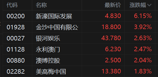港股濠赌股集体拉升上涨,新濠国际发展涨超6%,金沙中国涨4%,银河娱乐、永利澳门涨2.5%,澳博控股、美高梅中国涨2%。