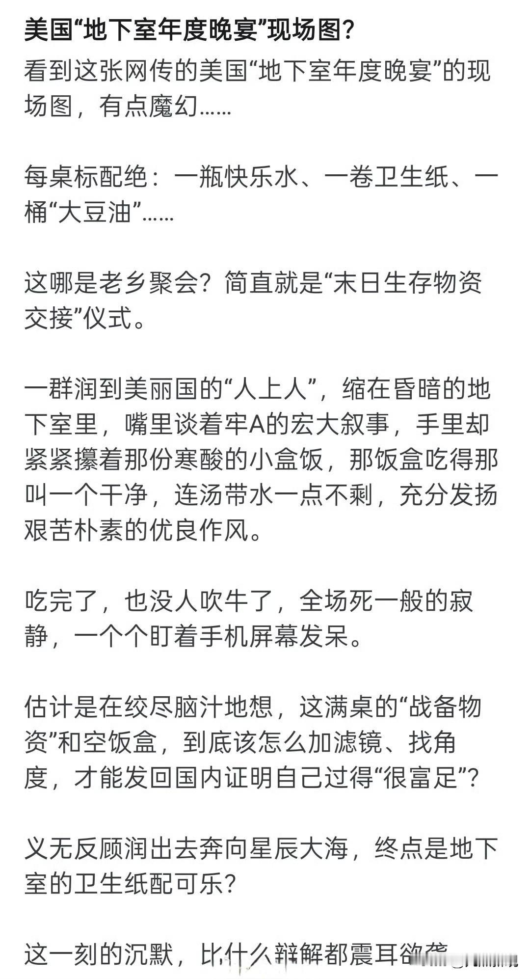 润到美国的一群国人,躲在地下室开“老乡会”,没有豪华大餐也没有高档的环境,有的只是简单的盒饭和廉价的“快乐水”,现场气氛沉闷看不到任何喜悦,如果不是那面美国国旗,这样的环境说是在缅甸打黑工也完全没问题。