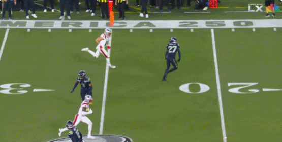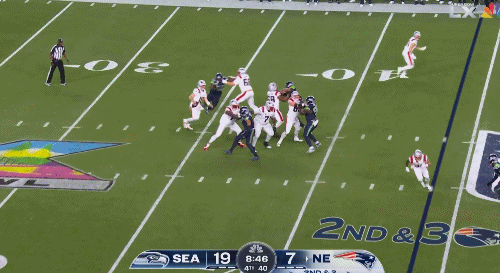 第二节,肯尼斯·沃克三世制造爱国者多次错失擒抱,沿边线推进30码!还剩11分钟时,迈尔斯射门命中再拿3分,海鹰6-0领先爱国者。