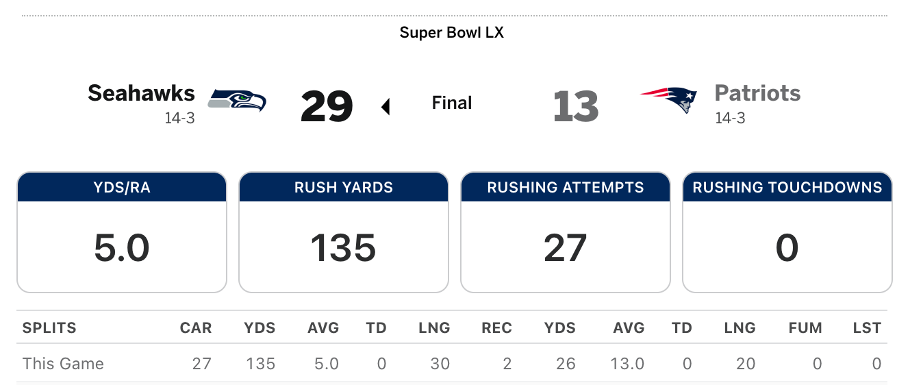 全场比赛,沃克共冲跑27次,冲跑码数135码,平均冲跑码数5.0码,其中单次最长冲球码数30码。