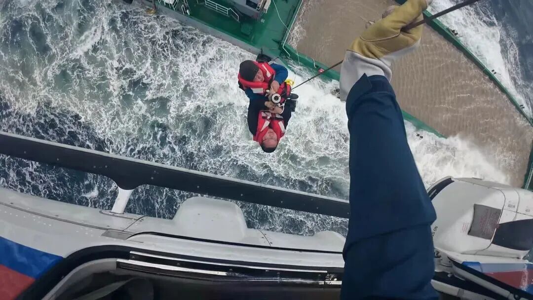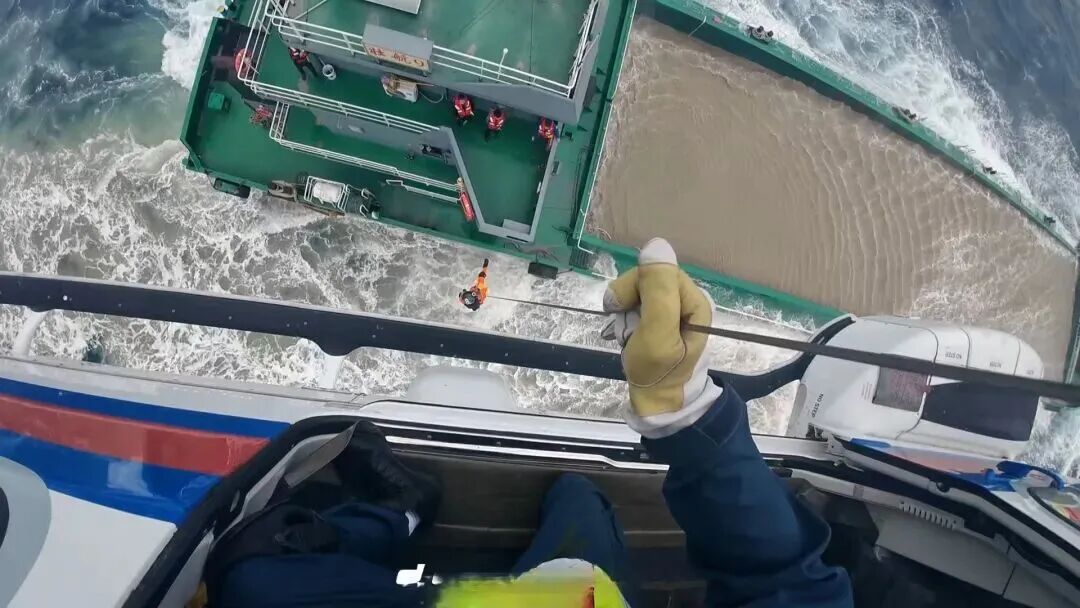 救助机组克服风浪大、船体不稳等不利因素,救生员连续开展5次吊运作业,利用高绳引导的方式,仅用20分钟便成功将10名遇险船员安全转移至直升机上,剩余4名船员不愿弃船,选择留守船舶。15时30分,“B-72CT”救助直升机搭载获救船员返航,“B-7341”救助直升机留守现场持续守护。