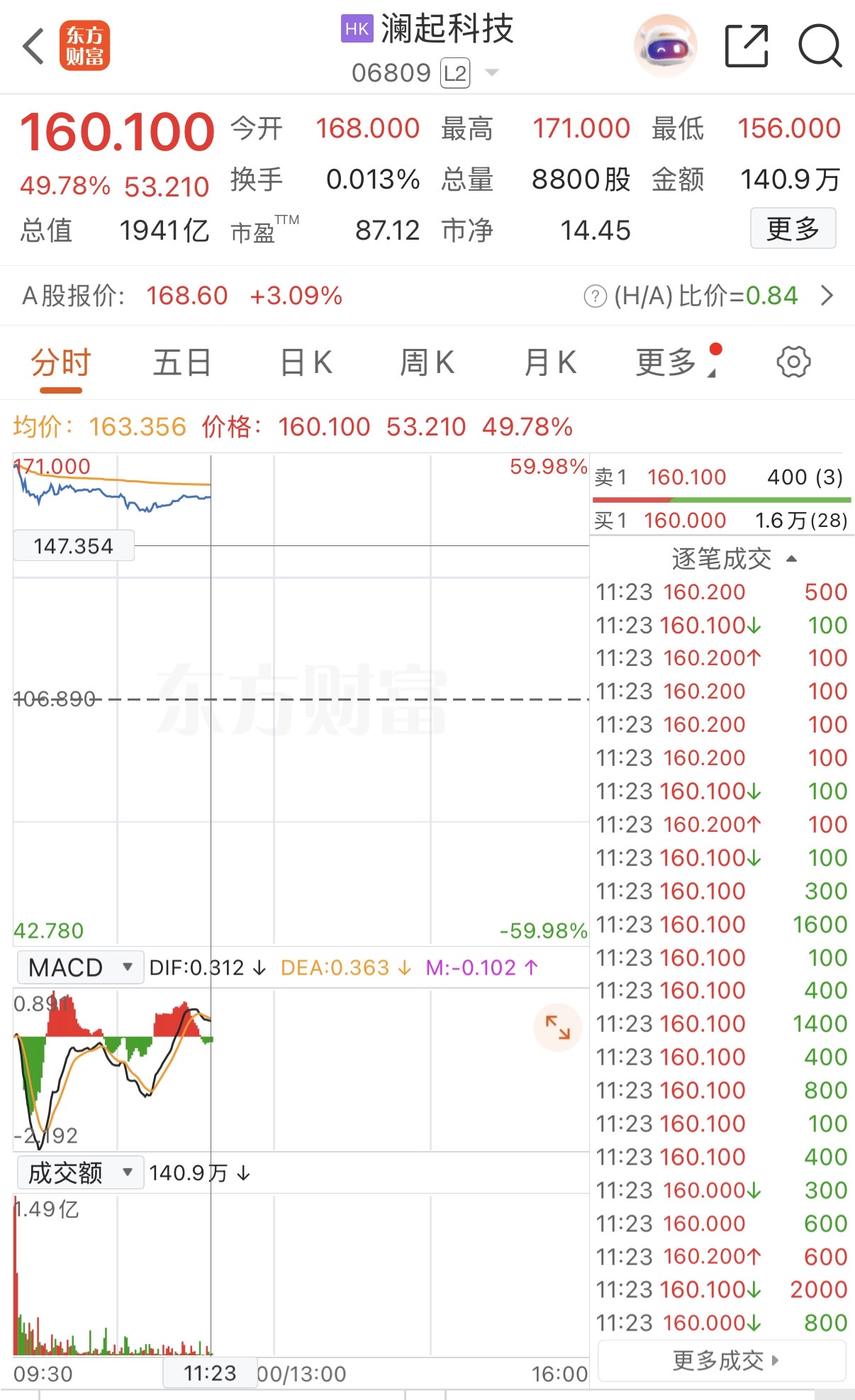 上证报中国证券网讯(记者孔令仪)2月9日,澜起科技正式登陆港交所,最终发售价为106.89港元/股。上市首日早盘,澜起科技H股一度涨近60%,最高报171港元/股。截至11时23分,澜起科技H股报160.1港元/股,涨49.78%。