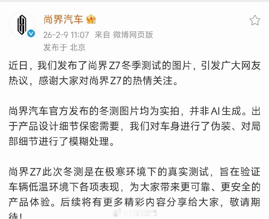 官方回应来了:此前尚界Z7冬测照片引发一些人质疑。均为实拍,非AI生成。 这下大