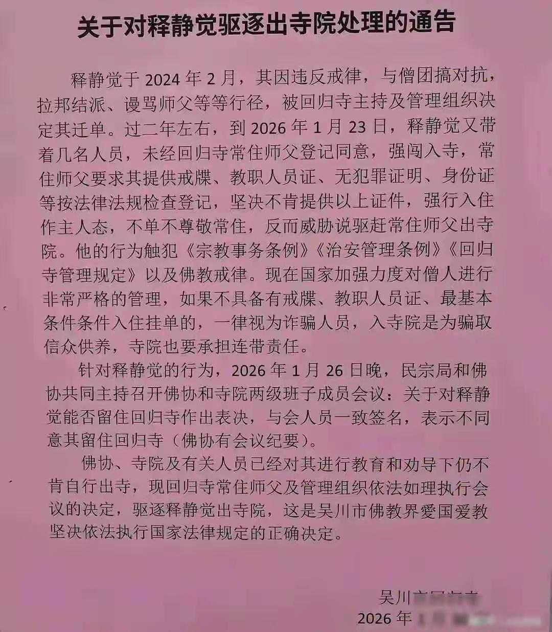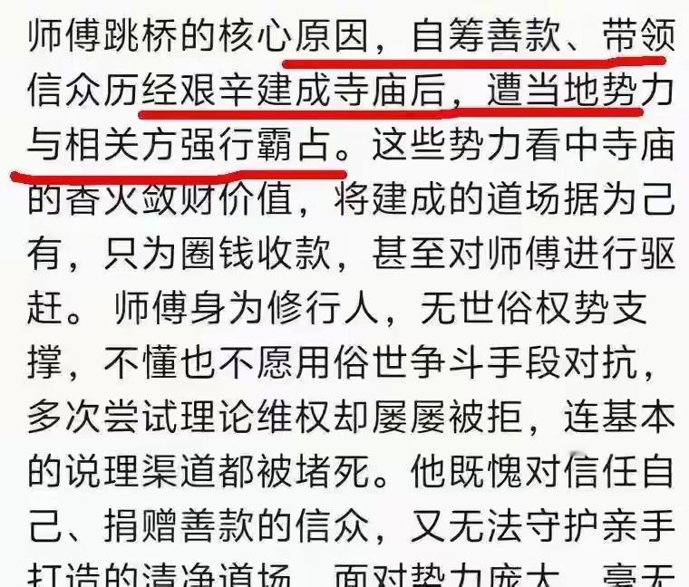 吴川回归寺的“扶灯大师”释静觉这事挺让人好奇的,是什么让一个出家人看破红尘欲跳河轻生?他到底怎么进的医院?各种说法都有,让人真假难辨啊。 他到底怎么进的医院,一说是民警到场为了阻止他跳河,把他从河栏杆上拉下来导致他摔倒受伤才进了医院。另一说是他还是跳河了,被村民救上来后送进医院的,还说肺部有积水。两种说法的文章头条上都刷到,似乎都有可能。不过,万幸的是“扶灯大师”还活着。 “扶灯大师”释静觉为何看破红尘?有当地的公告说他违反戒律、对抗僧团、辱骂住持。可他曾经牵头筹集经费修了回归寺啊,不应该有这样的言行啊? 继续刷,还真刷到一言信息。原来有网友说当地要对回归寺周边进行文旅开发,“扶灯大师”反对开发方案,这可能也是他没当成住持以及被迁单的原因。 由于被回归寺迀单了,他进不了回归寺,他和弟子连安身之地也没了,所以他才想跳河寻死,以表达自己的不满和失望吧。真没想到,只想当个出家人也这么难! 据说“扶灯大师“已从医院ICU病房转到了普通病房,我在想,他出院后能去哪呢?那个让他付出了多年心血和精力的吴川回归寺,还能重新接纳他吗?(网图侵删)