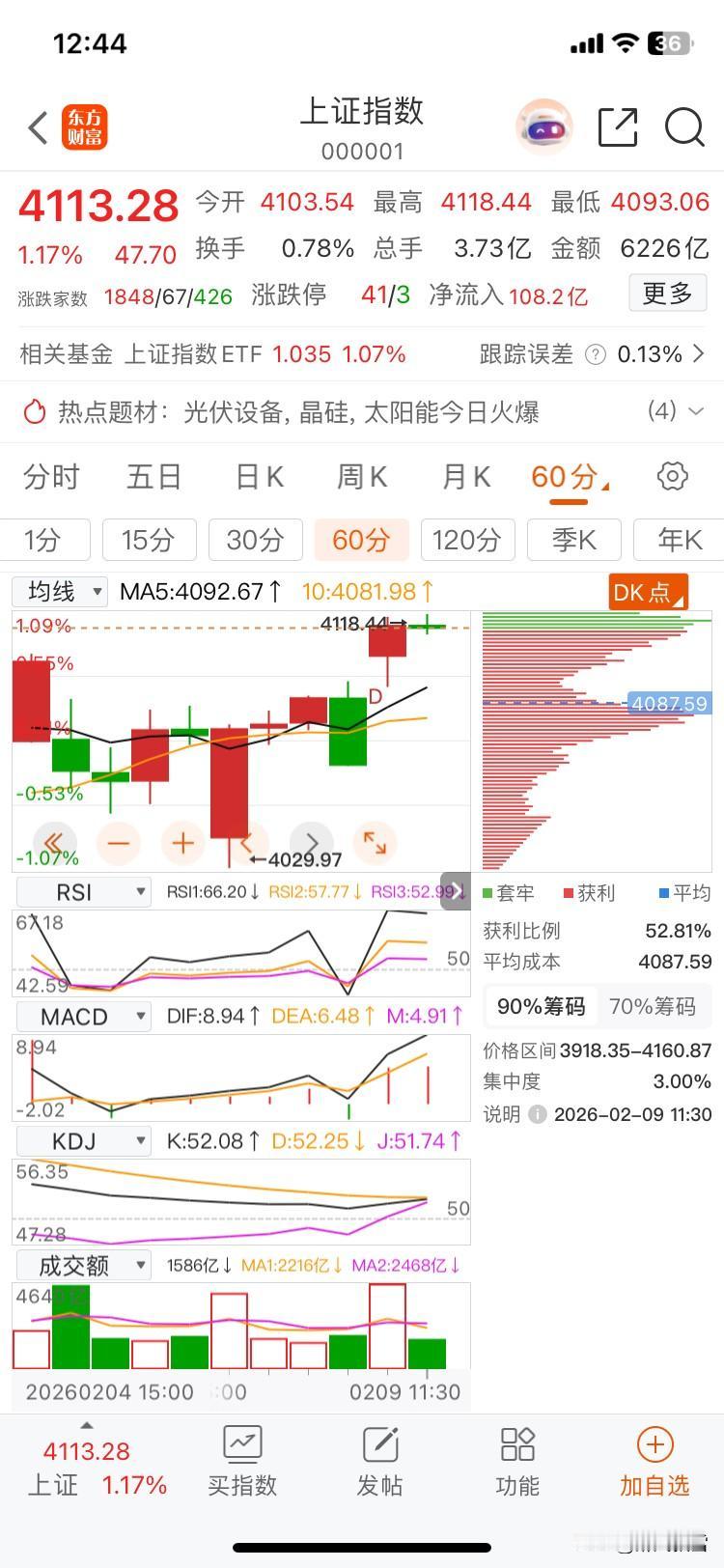 2月9日午盘 10:30,市场放量上攻,上午量能虽有放大但略显不足,预计全天成交约2.4万亿元。午后多头力量延续强势格局,主力资金未现分歧,光伏设备等热点板块领涨,指数稳步上行,市场情绪偏暖,做多动能充足。 大趋势向上未改,节奏放慢而已,量不足,控仓做多!