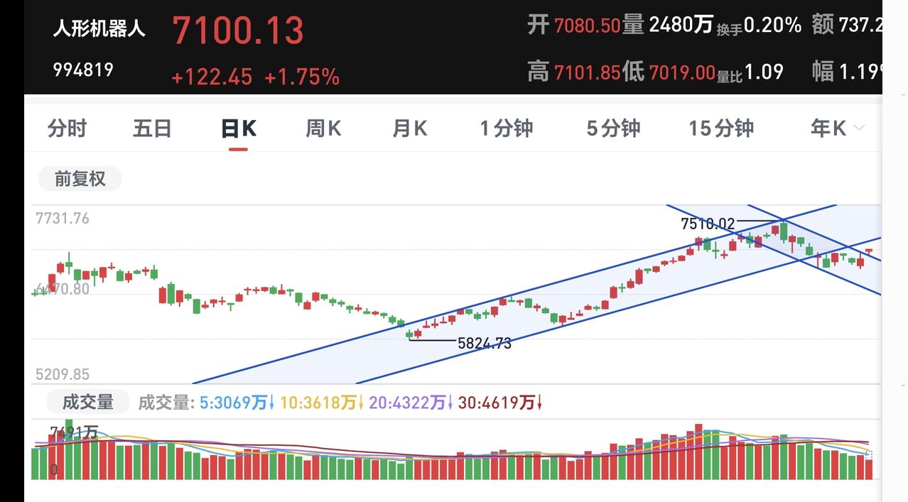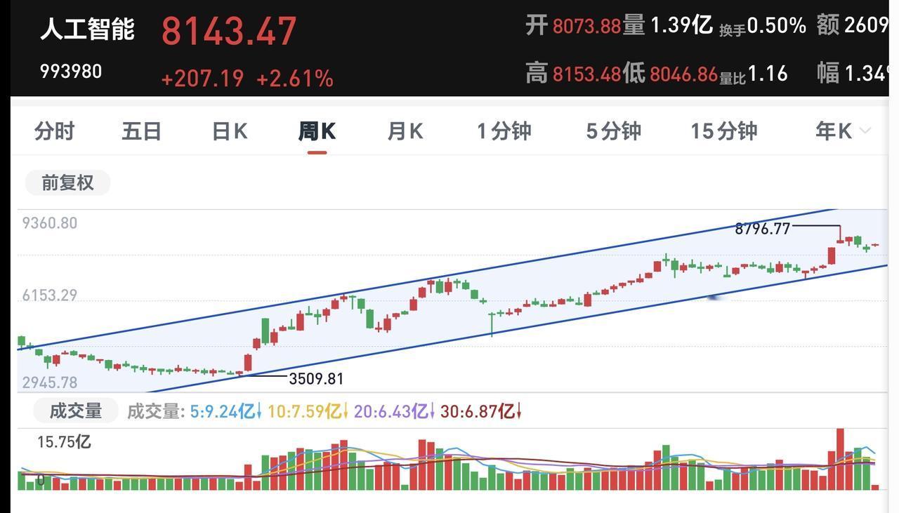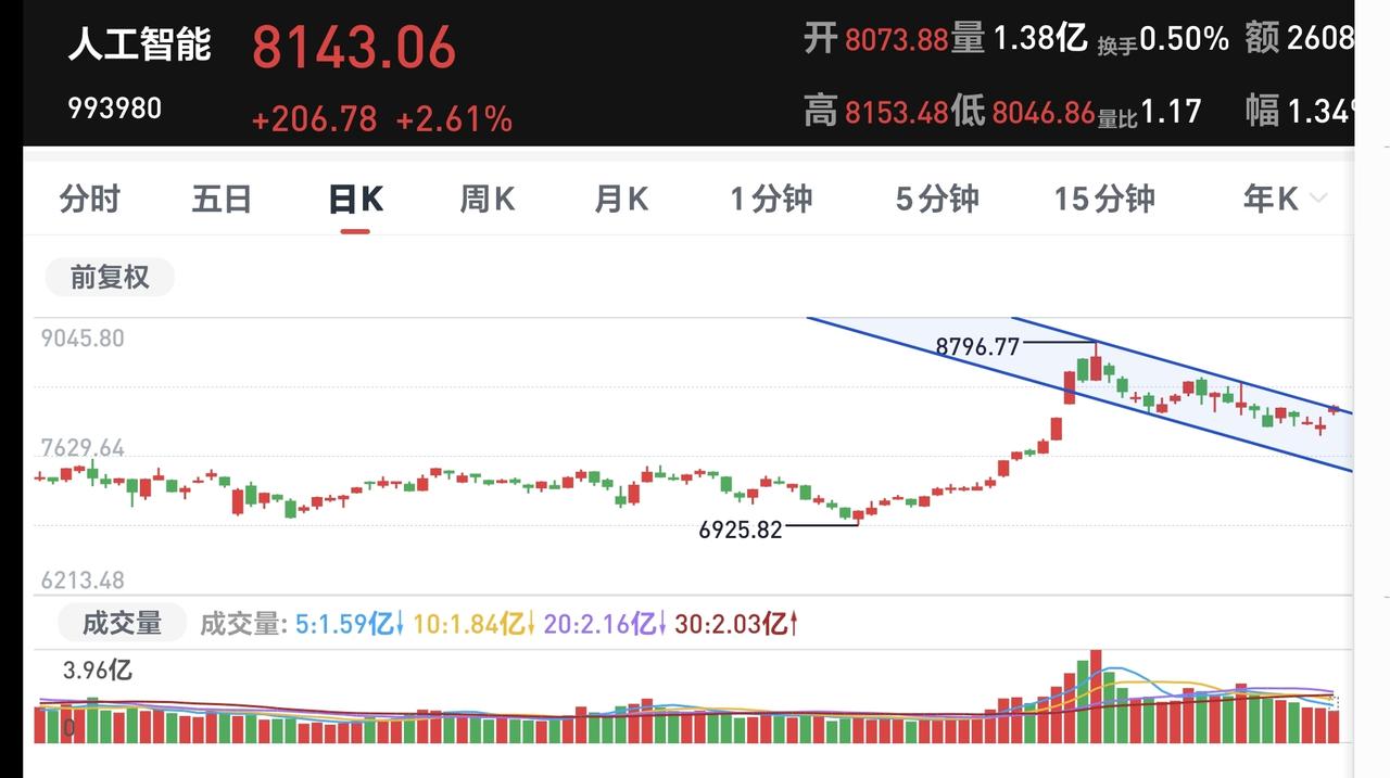 基金:三大指数全线上涨,今天究竟应该怎么办 下午开盘以后,盘面并没有发生变化,还是在高位横盘震荡当中,黄色线还是在蓝色线上方,两条线之间的敞口还不是非常大,成交量的放量幅度也还是8%,并没有放大和缩小,创业板指上涨了2.85%,盘中点位3328点,上证指数上涨了1.24%,盘中点位4115点。 上涨家数还是保持在4300多家,下跌家数只有900多家,涨停家数增加到了81家,跌停家数还是7家,主力资金净流入303亿。 持有的基金盘中估值整体上涨了1.76%,上涨幅度最大的三个板块是:AI应用板块,5G板块,芯片半导体板块,下跌的只有白酒板块。 我把持有的基金金额都调整为了100块钱,这样就可以在盘中看到实时估值,今天的盈亏金额就是今天的盈亏幅度,但这样看不到每只基金真实的盈亏金额,大家可以看一下,是看现在设置为每只基金100块钱持有金额方便,还是看原来真实金额的方便,大家可以在评论区告诉我一下,我会在晚上做出决定,要不要改回原来真实的金额。 上涨幅度最大的三个板块是cpo板块,通信板块,人工智能板块。 今天科技类板块上涨幅度比较大,我们来看一下与科技类板块息息相关的科创50板块的情况,前段时间,科创50板块下跌跌破了日线级别上涨通道的下轨线,到现在为止还没有收回到原先的上涨通道内,这个板块日线级别上涨趋势被改变的状态还没有变化,最起码是还没有看到变化的证据,想进场的人还是需要耐心的等待。 科创50板块周线级别处于上涨通道中,这个板块的周线级别是上涨趋势,短期的涨跌改变不了这样的上涨趋势,长线持有的人可以继续持有,只有当周线级别上涨趋势被改变的时候,才可以考虑要不要止盈出来观望。 机器人板块今天也是上涨的,今天上涨突破了日线级别短期下跌通道的上轨线,这个板块日线级别短期下跌趋势有可能已经被改变,短线想进场的人,今天可以考虑要不要进场。 机器人板块周线级别处于上涨通道中,周线级别处于上涨趋势中,这个板块的大方向是向上的,长线持有的人可以继续持有。 人工智能板块今天上涨来到了日线级别短期下跌通道上轨线上。如果这里形成有效突破,短线想进场的人,可以考虑要不要进场。 人工智能板块周线级别处于上涨通道中,周线级别处于上涨趋势中,长线持有的人可以继续持有,除非这样的上涨趋势被改变。 AI应用板块也就是软件板块,日线级别还是处于下跌通道中,今天的上涨并没有改变日线级别的下跌趋势,想进场的人还需要耐心等待,上涨突破下跌通道上轨线的时候,可以考虑一下要不要进场。 AI应用板块周线级别处于上涨通道中,这个板块处于周线级别上涨趋势中,长线持有的人可以继续持有,在周线级别上涨趋势没有被改变之前,都可以继续持有。 商业航天板块日线级别还处于下跌通道中,今天的上涨并没有能够改变日线级别短期下跌趋势,在这样的下跌趋势被改变之前,都不要考虑进场。 商业航天板块周线级别处于上涨趋势中,现在的位置处在上涨通道的上方,长线持有的人可以继续持有,但长线持有的人,进场也是需要谨慎。 到现在为止的盘面走势变化不大,黄色线的位置没有变化,成交量没有能够有效放大,春节之前还有四个交易日,我们多一份谨慎,我们多一些清醒,这样才能够在春节期间从从容容,这样才可以在春节游玩期间轻轻松松。 今天有可能就是春节红包的开始,今天也有可能并不是春节红包的开端,我们无所谓他的上涨和下跌,我们只要知道它上涨多了怎么办,它下跌多了怎么办,今天究竟应该怎么办?我会在评论区留言。 1:我的持有基金情况,大家是喜欢真实的金额,还是喜欢设置为100块钱的金额? 2:现在有没有想进场怕踏空的感觉,现在有没有想离场怕卖飞的感觉,现在是不是无所谓它的涨跌,因为,今天的涨跌并没有改变上证指数和创业板指处于日线级别短期下跌通道中的状况。
